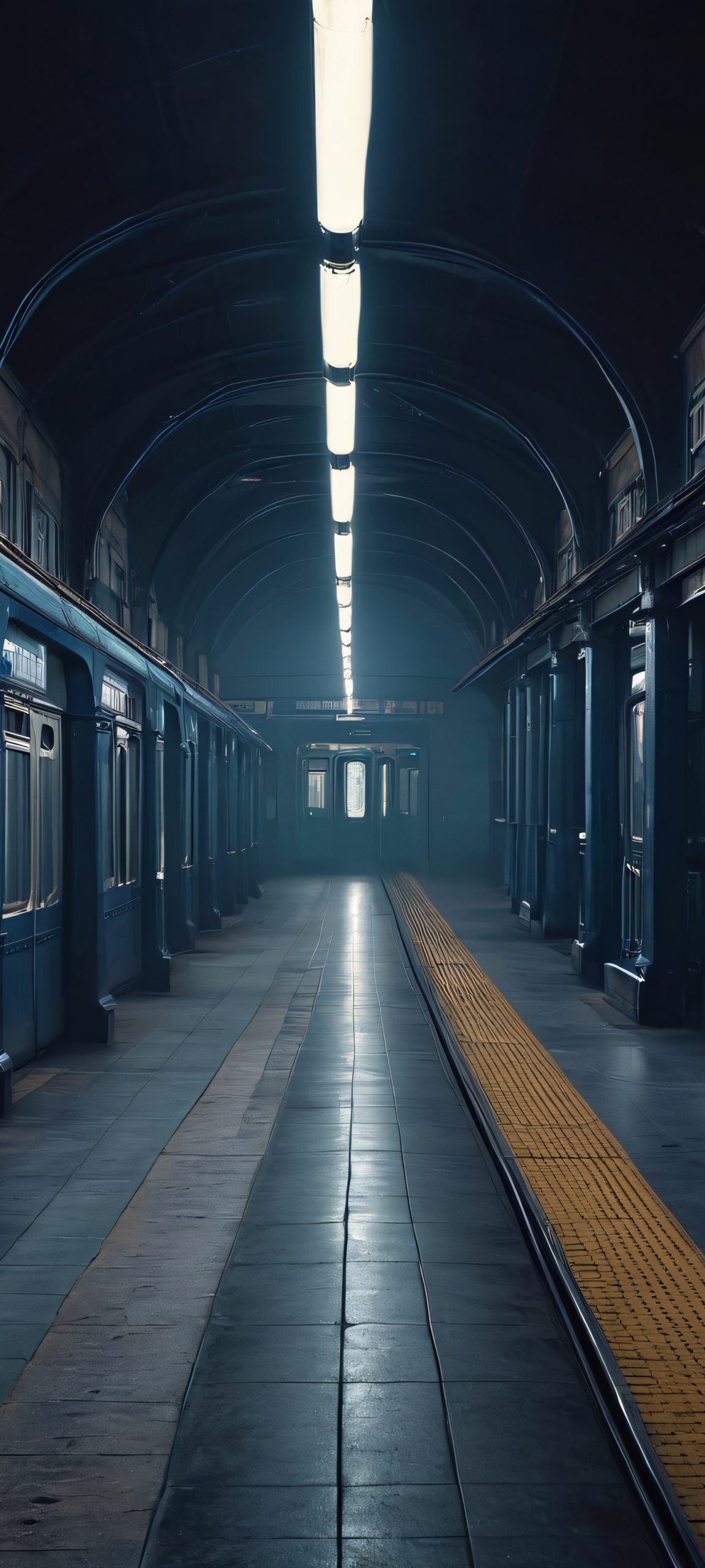 iPhone and Android mobile wallpaper featuring an abandoned train station with flashlights casting a moody glow. Perfect for dark-themed home screens.