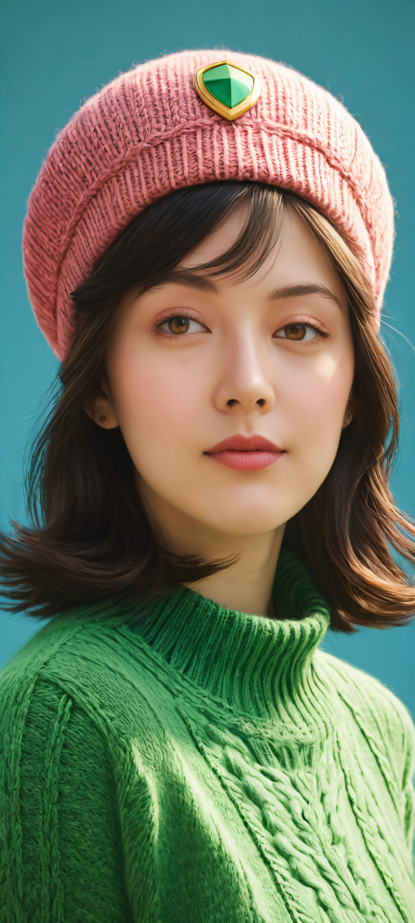 A breathtaking vertical portrait artwork of Adeleine, placed in the lower-middle with intricate micro-details of her Kirby-themed helmet and berets., Perfectly clean and empty top half with vast pure void, contrasting with Adeleine’s vibrant green sweater, wheels, and Nintendo-inspired design elements in the lower-middle., Award-winning digital art, pristine clarity, showcasing exceptional rendering quality., Ethereal softbox lighting with subtle gradient effects, creating a sense of depth and dimensionality. Radiant colors and ray-traced reflections bring out the textures and details., Dominant green tone with pops of blue from Adeleine’s sweater and the background, creating a visually stunning and harmonious color palette., ethereal lighting, radiant, brilliant colors, ray traced reflections, pristine clarity, portrait composition, centered subject in the lower middle, perfectly clean and smooth top half for UI, extreme depth of field blurred background, highly textured surfaces, intricate micro-details, physically based rendering, award-winning digital art, epic breathtaking scale, stunning visual impact, perfect composition, macOS wallpaper aesthetic, masterpiece, 2K QHD resolution, 9:20 aspect ratio.