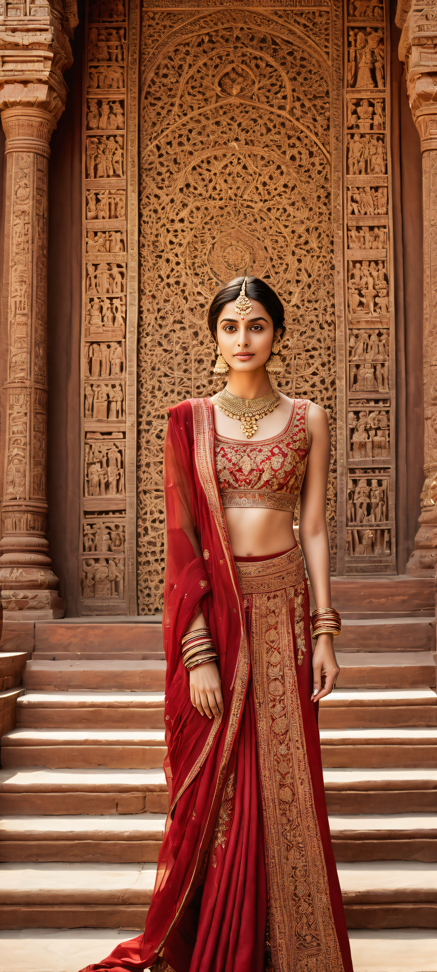 A breathtaking vertical portrait artwork of Alia Atreides placed in the lower-middle with intricate micro-details of her intricate clothing and accessories standing at the steps of a majestic temple throne room, perfectly centered., Perfectly clean and empty top half with vast pure void, while the lower half reveals the grandeur of the temple complex in the ultrawide 16:9 aspect ratio, immersing the viewer in an epic desktop wallpaper experience, Award-winning digital art, pristine clarity, and stunning visual impact, reminiscent of a masterpiece on a high-end device, showcasing Apple UI level quality, Sleek Dark Mode aesthetic dominates with deep perfect blacks, striking crisp contrast, and elegant luminescent accents, with sunlight filtering through the temple’s architectural details, subtly highlighting the intricate design, A palette of muted earthy tones, from the sandy dunes to the rich wood textures, evoking a sense of mystique and ancient wisdom, with Alia’s attire standing out as a focal point in shades of golden brown and crimson red, elegant low-key lighting, deep perfect blacks, striking contrast, sleek dark mode aesthetic, luminescent accents, deep rich colors, portrait composition, centered subject in the lower middle, perfectly clean and smooth top half for UI, extreme depth of field blurred background, highly textured surfaces, intricate micro-details, physically based rendering, award-winning digital art, epic breathtaking scale, stunning visual impact, perfect composition, macOS wallpaper aesthetic, masterpiece, 2K QHD resolution, 9:20 aspect ratio.