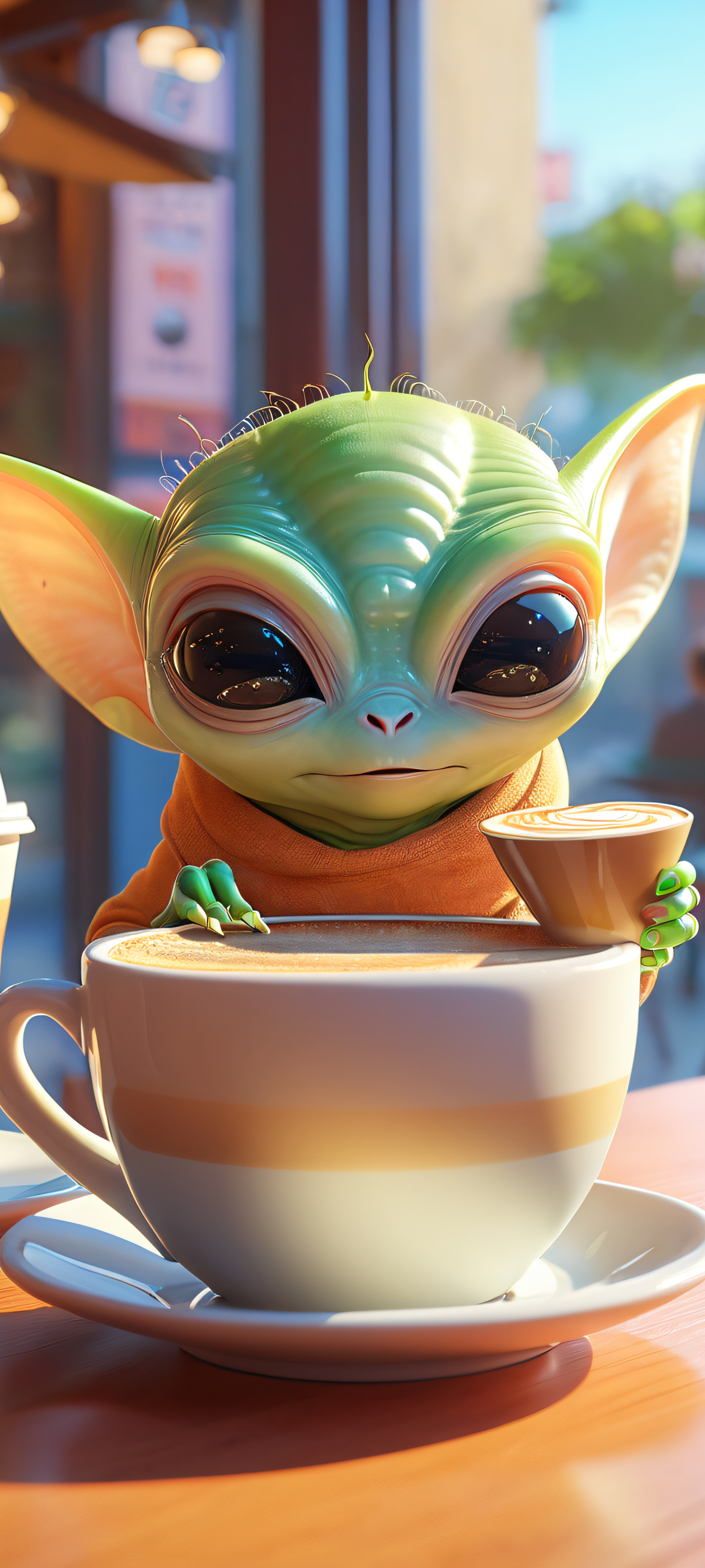 A cute alien sipping coffee at a cozy shop, lit by soft morning light. Perfect for iPhone and Android home screens.
