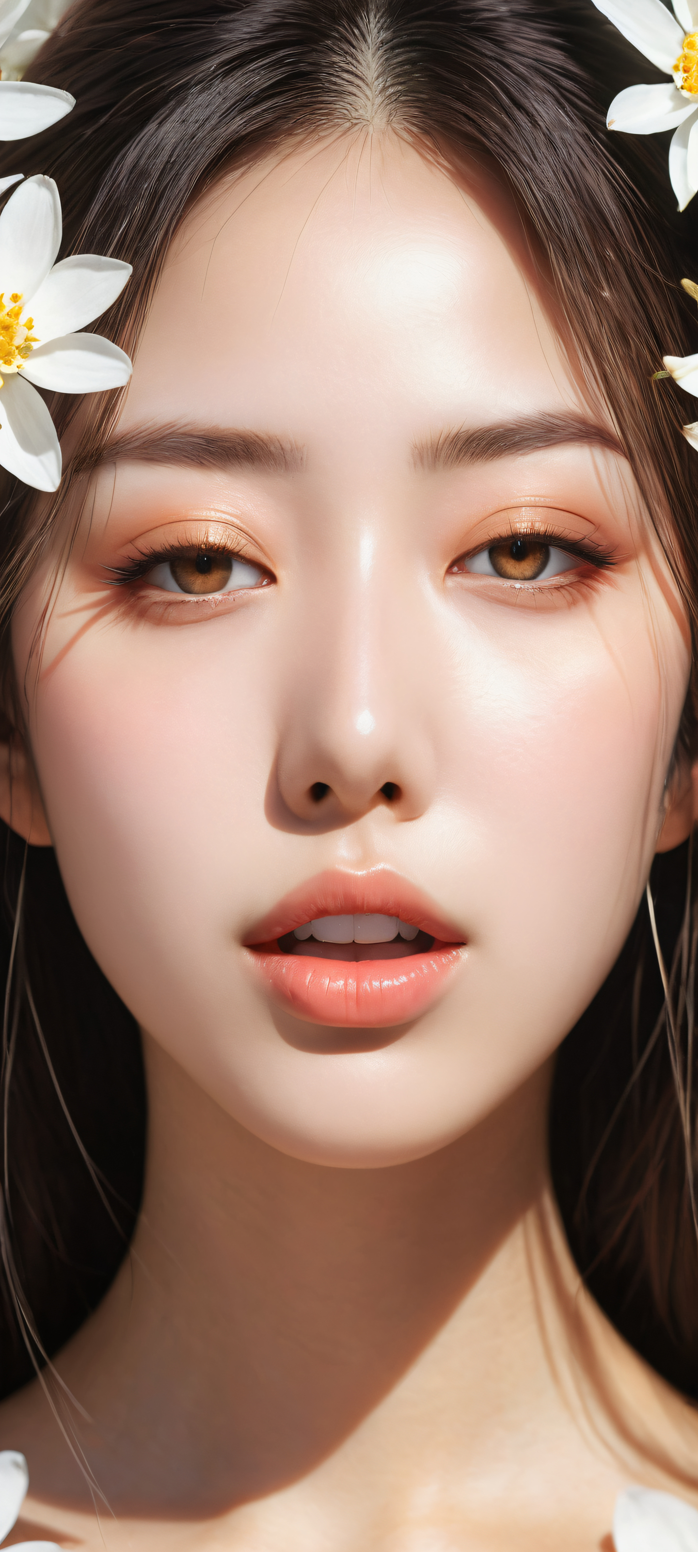 A breathtaking vertical portrait artwork of Anime girl with one eye closed, tongue out, and long hair, placed in the lower-middle with insane micro-details. Extreme depth of field., Perfectly clean and empty top half with vast pure void, and a bottom half featuring white flowers in Japanese-inspired setting., Award-winning digital art, stunning visual impact, and pristine clarity., Ethereal lighting with soft, radiant colors and ray-traced reflections. Bright and airy, yet nuanced to highlight the subject’s features., #FF69B4, #8F0A1A, #34C759, and #455A64, ethereal lighting, radiant, brilliant colors, ray traced reflections, pristine clarity, portrait composition, centered subject in the lower middle, perfectly clean and smooth top half for UI, extreme depth of field blurred background, highly textured surfaces, intricate micro-details, physically based rendering, award-winning digital art, epic breathtaking scale, stunning visual impact, perfect composition, macOS wallpaper aesthetic, masterpiece, 2K QHD resolution, 9:20 aspect ratio.
