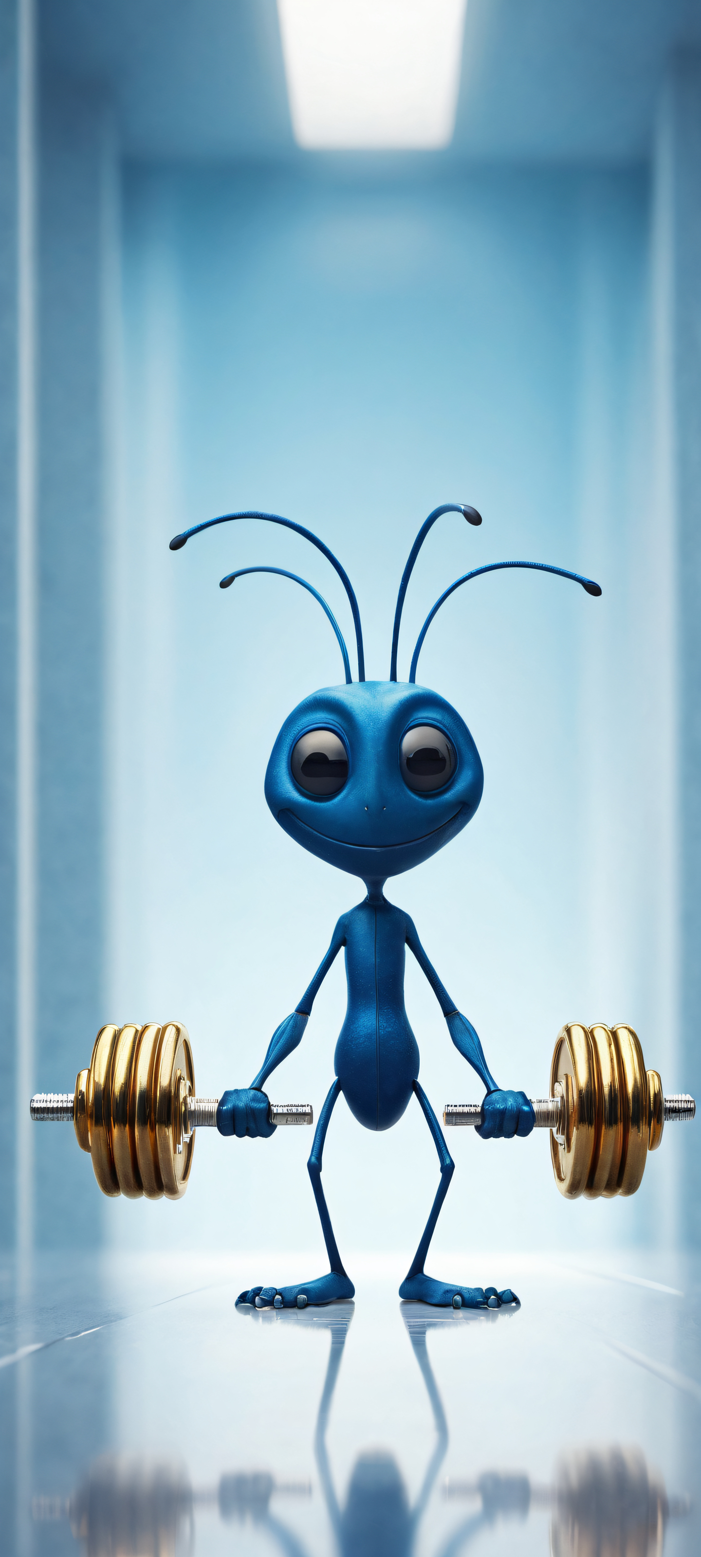 A breathtaking vertical portrait artwork of Ant placed in the lower-middle, intricate micro-details of its tiny dumbbell-lifting form, showcasing incredible bodybuilding prowess in a miniature gym., A perfectly clean and empty top half, giving way to a vast pure void that emphasizes the ant’s impressive feats., Award-winning digital art with stunning visual impact and pristine clarity., Ethereal lighting with radiant colors, ray-traced reflections, and exceptional clarity. The scene is bathed in an airy brightness., Vibrant shades of metallic gold, deep blues, and creamy whites, evoking a sense of humor and playfulness., ethereal lighting, radiant, brilliant colors, ray traced reflections, pristine clarity, portrait composition, centered subject in the lower middle, perfectly clean and smooth top half for UI, extreme depth of field blurred background, highly textured surfaces, intricate micro-details, physically based rendering, award-winning digital art, epic breathtaking scale, stunning visual impact, perfect composition, macOS wallpaper aesthetic, masterpiece, 2K QHD resolution, 9:20 aspect ratio.