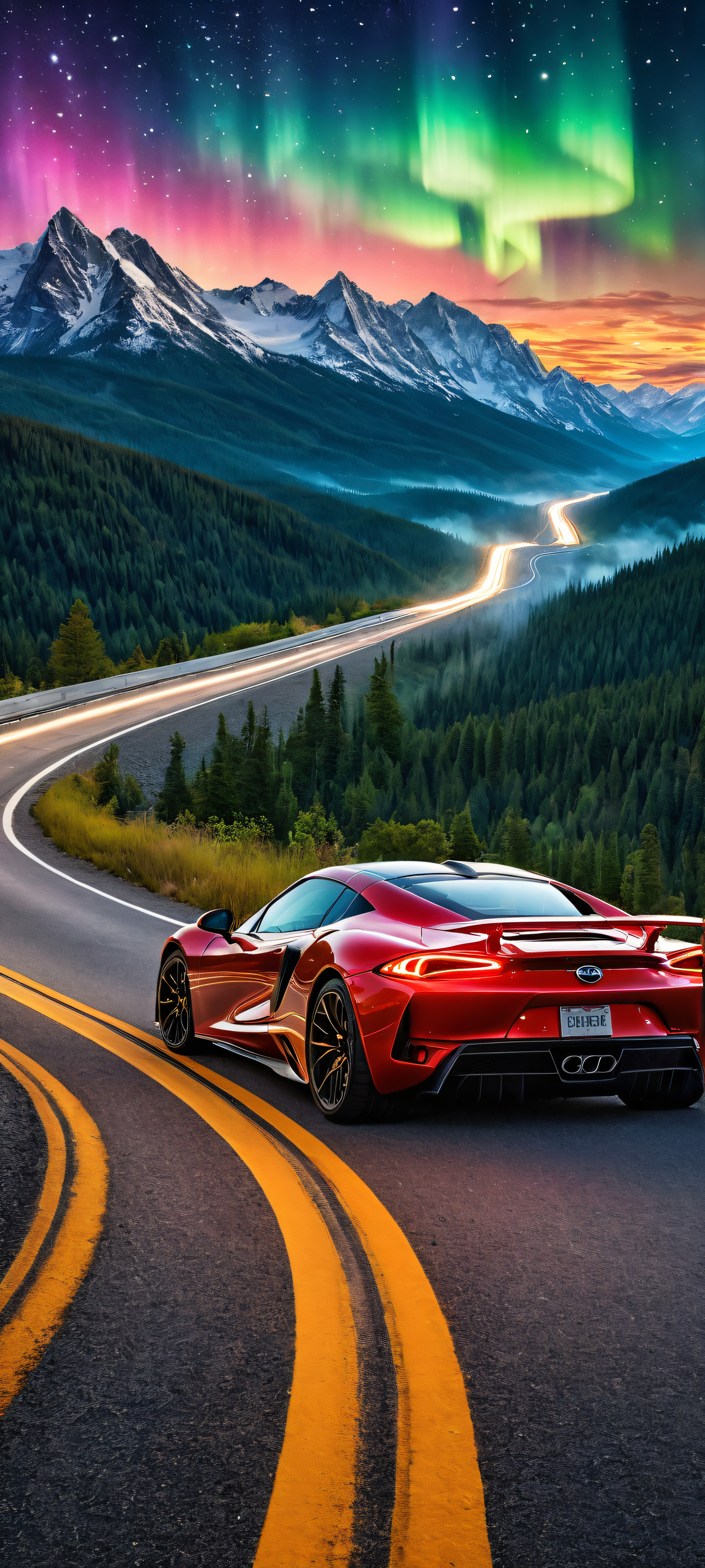 A breathtaking vertical portrait artwork of Aurora placed in the lower-middle, intricate micro-details of vehicle taillights, stars, and mountains in the vast sky during take-off., vertical background, Award-winning digital art, pristine clarity, stunning visual impact, reminiscent of a masterpiece., radiant lighting, vibrant colors, ethereal lighting, radiant, brilliant colors, ray traced reflections, pristine clarity, portrait composition, centered subject in the lower middle, perfectly clean and smooth top half for UI, extreme depth of field blurred background, highly textured surfaces, intricate micro-details, physically based rendering, award-winning digital art, epic breathtaking scale, stunning visual impact, perfect composition, macOS wallpaper aesthetic, masterpiece, 2K QHD resolution, 9:20 aspect ratio.
