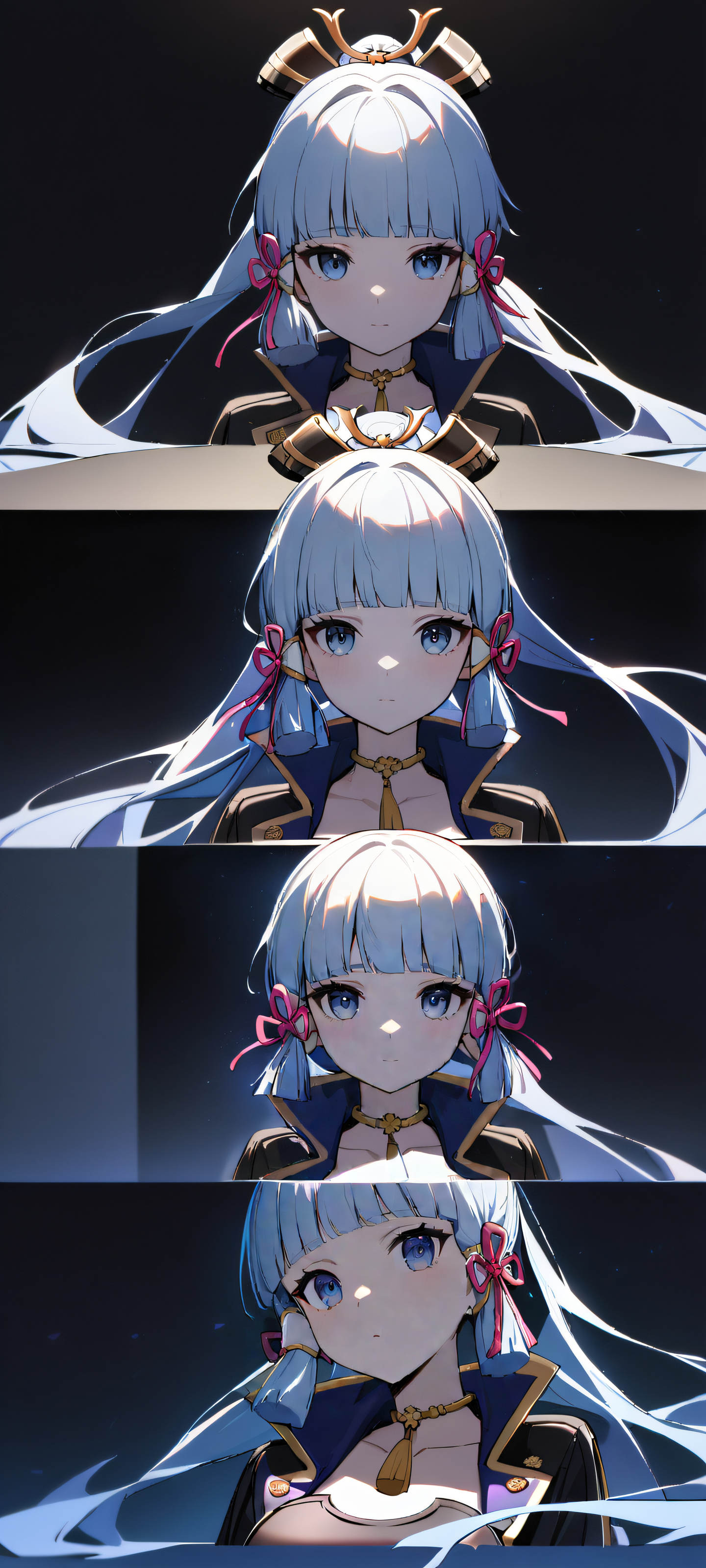 1girl, kamisato ayaka, genshin impact, solo, masterpiece, best quality, very aesthetic, absurdres, highly detailed, looking at viewer, portrait composition, centered subject in the lower middle, perfectly clean and smooth top half for UI, Perfectly clean and empty top half with vast pure void, simple black background, Dominant palette of deep purples, rich browns, and subtle highlights, matching the requested mood, elegant low-key lighting, striking contrast, deep perfect blacks, night scene, glowing lights, dramatic shadows