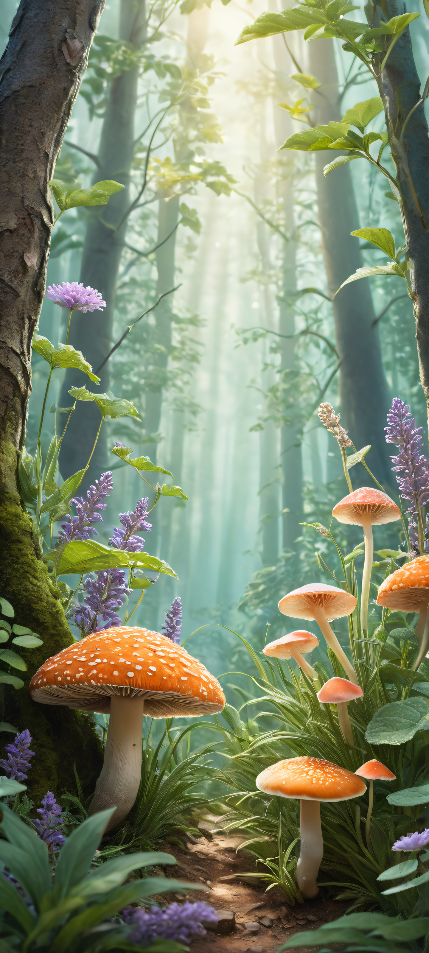 Step into this breathtaking digital art piece, perfectly optimized for your iPhone, Samsung Galaxy, and Android home screens. The intricate details of fungi and herbs take center stage, set against a stunning backdrop of soft pastels and subtle lighting effects. This whimsical portrait composition is reminiscent of a watercolor painting, with exquisite ray-traced reflections adding depth and dimension.