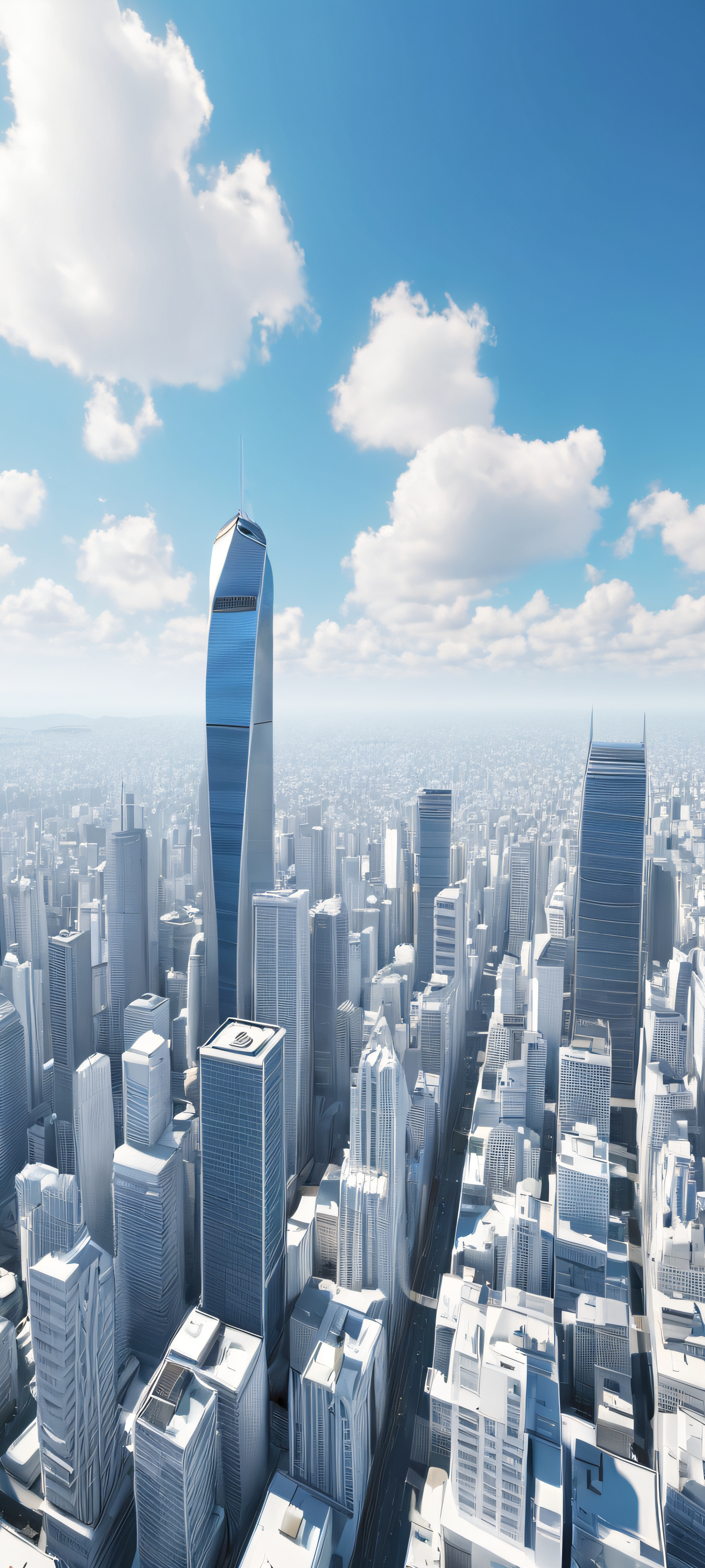 Indulge in this stunning vertical cityscape masterpiece, optimized specifically for iPhone, Samsung Galaxy, and Android home screens. This breathtaking image features a soft, realistic depiction of a city in daylight, with a soothing color palette of blues, grays, and whites.