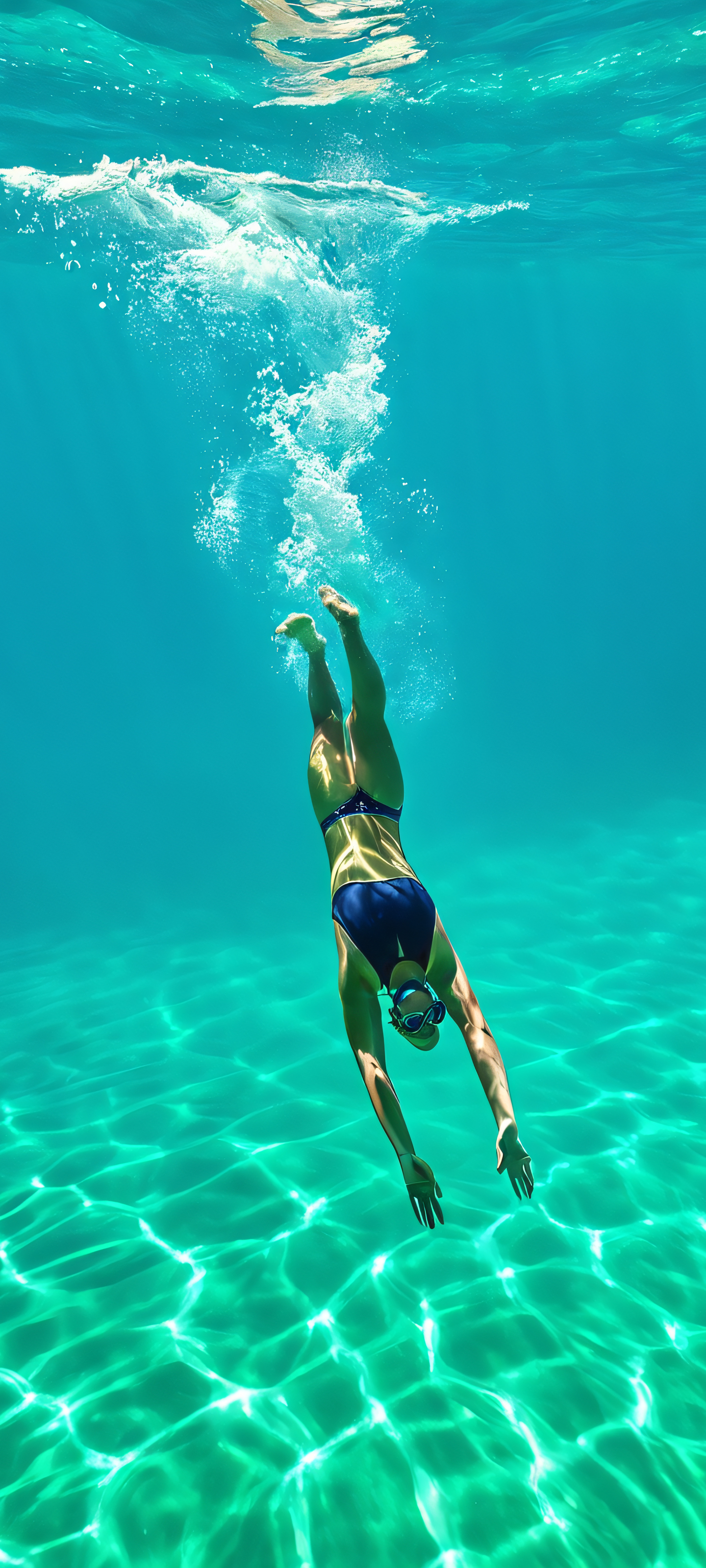 Elevate your mobile experience with this stunning vertical wallpaper featuring a beautifully rendered swimmer amidst a tranquil aquatic scene. Perfectly optimized for iPhone, Samsung Galaxy, and Android home screens, this masterpiece boasts 2K QHD resolution and exceptional detail, making it a must-have for anyone seeking a visually stunning phone wallpaper.