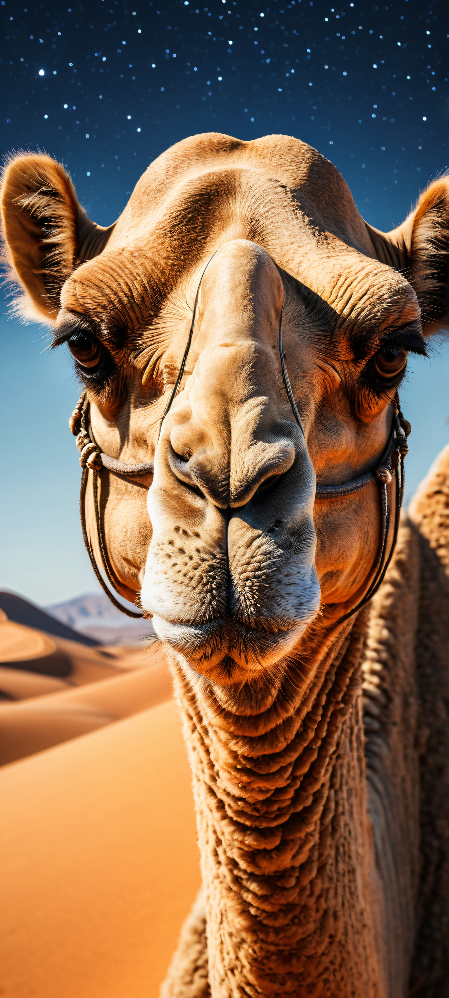 A breathtaking vertical portrait artwork of A camel’s intense gaze is placed in the lower-middle with intricate micro-details, its facial features stylized to match the scowl of a famous male black actor known for his perpetually pissed-off expression., Perfectly clean and empty top half with vast pure void, while the bottom half is a sprawling desert landscape with majestic dunes and starry night sky., Award-winning digital art, stunning visual impact, and pristine clarity., Ethereal, radiant lighting with brilliant colors, ray-traced reflections, and pristine clarity. The scene is bathed in an otherworldly glow, as if lit by a thousand tiny stars., Dominant palette of sandy neutrals, deep blues, and fiery oranges, evoking the mystique of the desert night., ethereal lighting, radiant, brilliant colors, ray traced reflections, pristine clarity, portrait composition, centered subject in the lower middle, perfectly clean and smooth top half for UI, extreme depth of field blurred background, highly textured surfaces, intricate micro-details, physically based rendering, award-winning digital art, epic breathtaking scale, stunning visual impact, perfect composition, macOS wallpaper aesthetic, masterpiece, 2K QHD resolution, 9:20 aspect ratio.