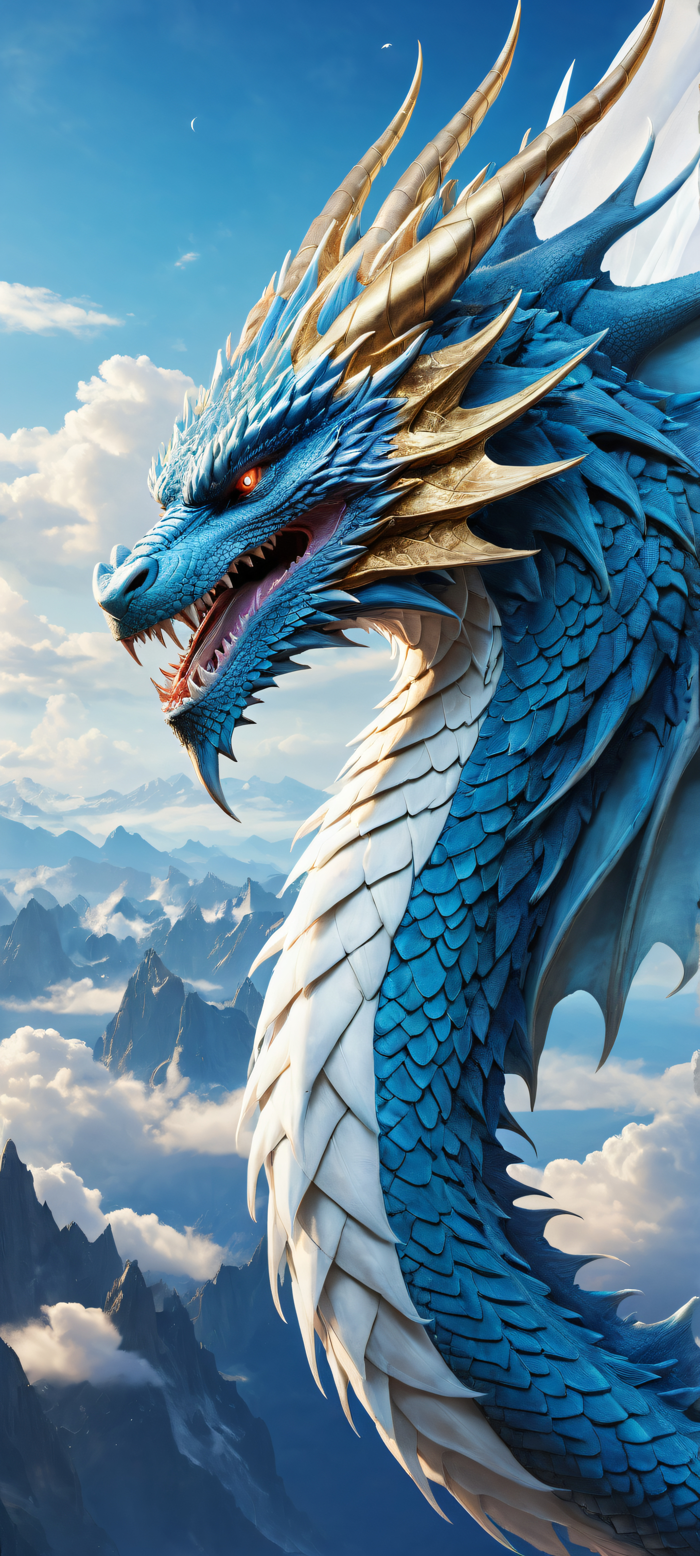 A breathtaking vertical portrait artwork of A majestic celestial dragon placed in the lower-middle with insane micro-details, showcasing intricate scales and swirling clouds., Perfectly clean and empty top half with a vast pure void, allowing for unobstructed UI breathing space., Award-winning digital art, stunning visual impact, and pristine clarity, reminiscent of cinematic masterpieces., Ethereal lighting with radiant, brilliant colors, ray-traced reflections, and perfect clarity, evoking an otherworldly sense of wonder., Dominant color palette features calming blues (#4567b7) and soft whites (#f5f5f5), with touches of shimmering gold (#ffd700) and mystical purple (#6c5ce7), ethereal lighting, radiant, brilliant colors, ray traced reflections, pristine clarity, portrait composition, centered subject in the lower middle, perfectly clean and smooth top half for UI, extreme depth of field blurred background, highly textured surfaces, intricate micro-details, physically based rendering, award-winning digital art, epic breathtaking scale, stunning visual impact, perfect composition, macOS wallpaper aesthetic, masterpiece, 2K QHD resolution, 9:20 aspect ratio.