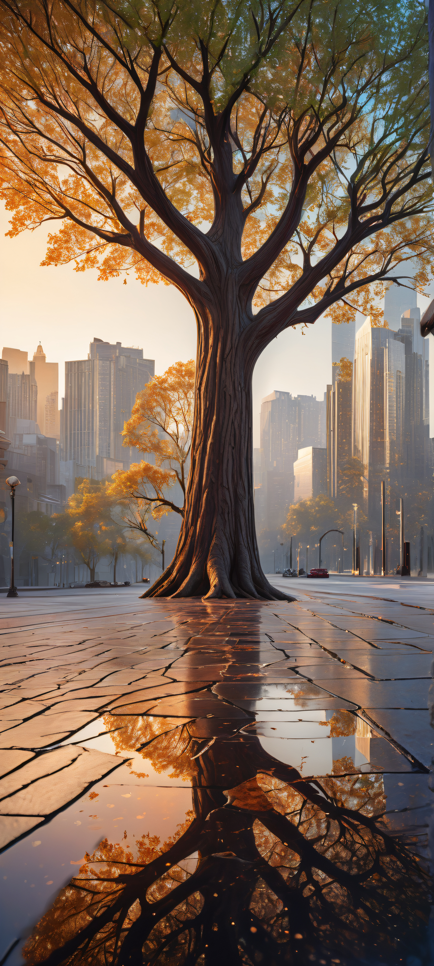 Perfectly optimized for iPhone, Samsung Galaxy, and Android home screens, this stunning visual masterpiece showcases a blend of organic and futuristic elements. The sleek modern building in the middle reflects the starry expanse, while the tree’s textured surface glows warmly under ethereal lighting.