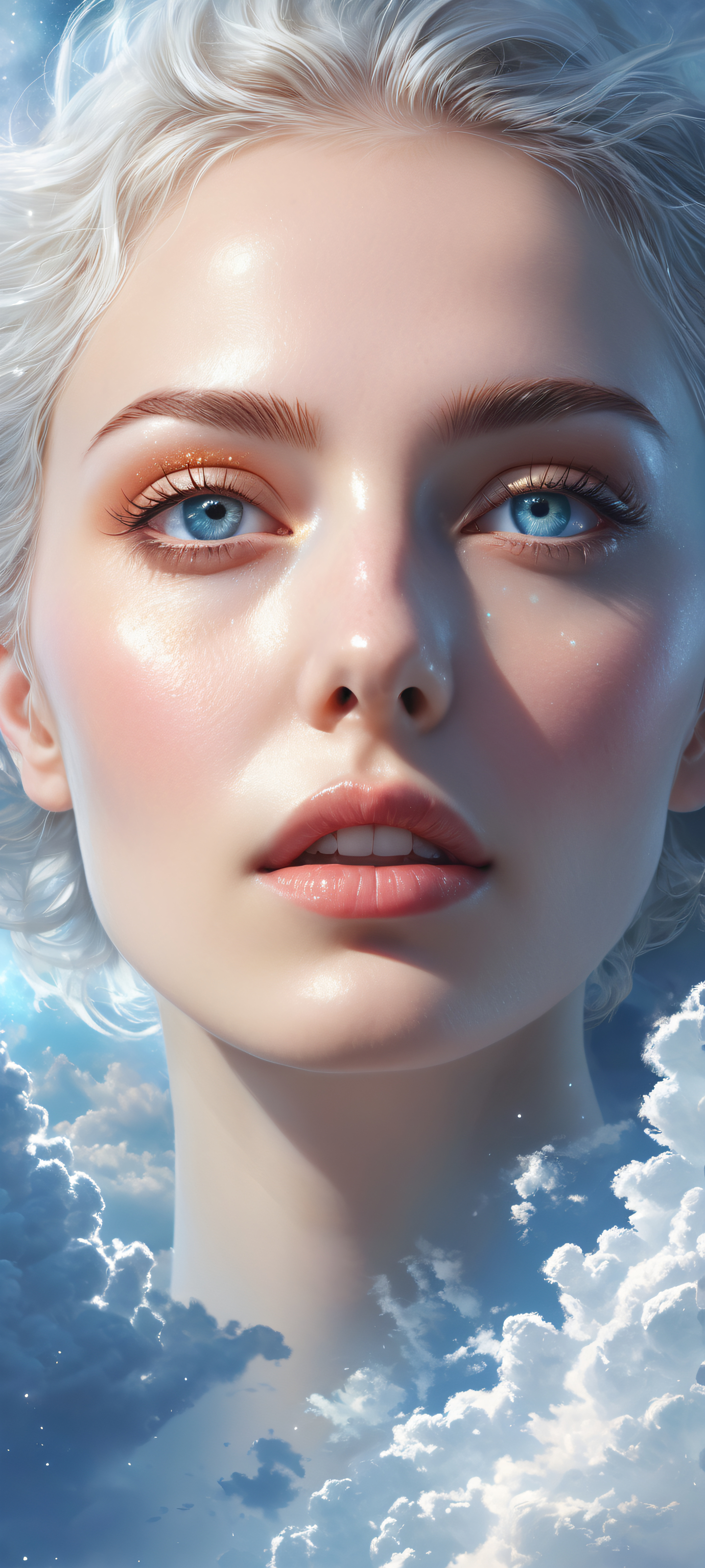 A breathtaking vertical portrait artwork of Stunning Celestial Face placed in the lower-middle, intricate micro-details, Perfectly clean and empty top half with vast pure void, detailed background of celestial clouds and stars, Award-winning digital art, pristine clarity, cinematic illustration with stunning visual impact, Ethereal lighting with radiant, brilliant colors, ray traced reflections, and pristine clarity, a bright and airy ambiance, [‘Soft Blues’, ‘Creamy Whites’, ‘Glowing Whites’], ethereal lighting, radiant, brilliant colors, ray traced reflections, pristine clarity, portrait composition, centered subject in the lower middle, perfectly clean and smooth top half for UI, extreme depth of field blurred background, highly textured surfaces, intricate micro-details, physically based rendering, award-winning digital art, epic breathtaking scale, stunning visual impact, perfect composition, macOS wallpaper aesthetic, masterpiece, 2K QHD resolution, 9:20 aspect ratio.