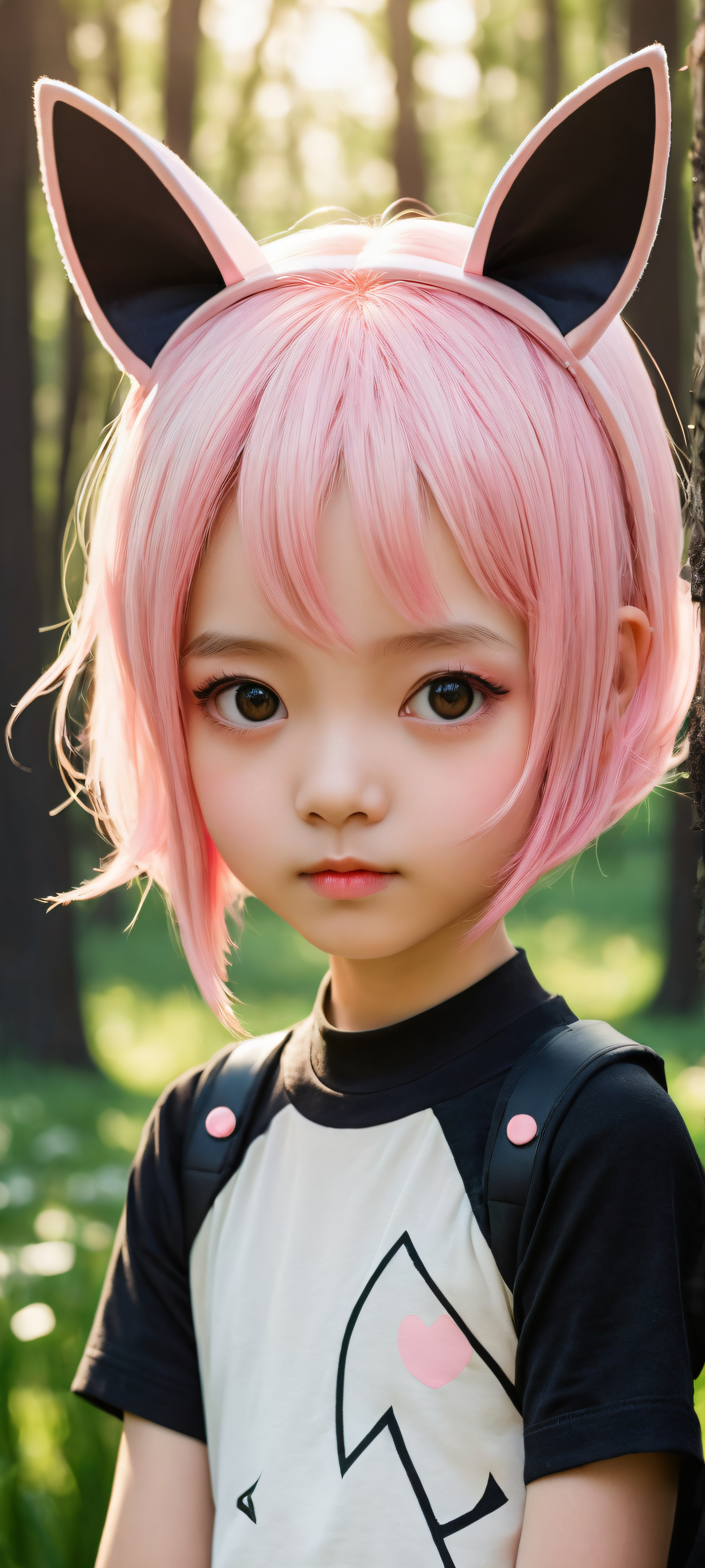 A breathtaking vertical portrait artwork of Chibi girl with pink hair and animal ears placed in the lower-middle, intricate micro-details, Perfectly clean and empty top half with vast pure void, tree and grass in the background, Award-winning digital art, pristine clarity, stunning visual impact, Sleek dark mode aesthetic: deep perfect blacks, striking crisp contrast, and elegant luminescent accents, #E6D8C3 (Soft Pink) & #F7F4F5 (Cream), elegant low-key lighting, deep perfect blacks, striking contrast, sleek dark mode aesthetic, luminescent accents, deep rich colors, portrait composition, centered subject in the lower middle, perfectly clean and smooth top half for UI, extreme depth of field blurred background, highly textured surfaces, intricate micro-details, physically based rendering, award-winning digital art, epic breathtaking scale, stunning visual impact, perfect composition, macOS wallpaper aesthetic, masterpiece, 2K QHD resolution, 9:20 aspect ratio.