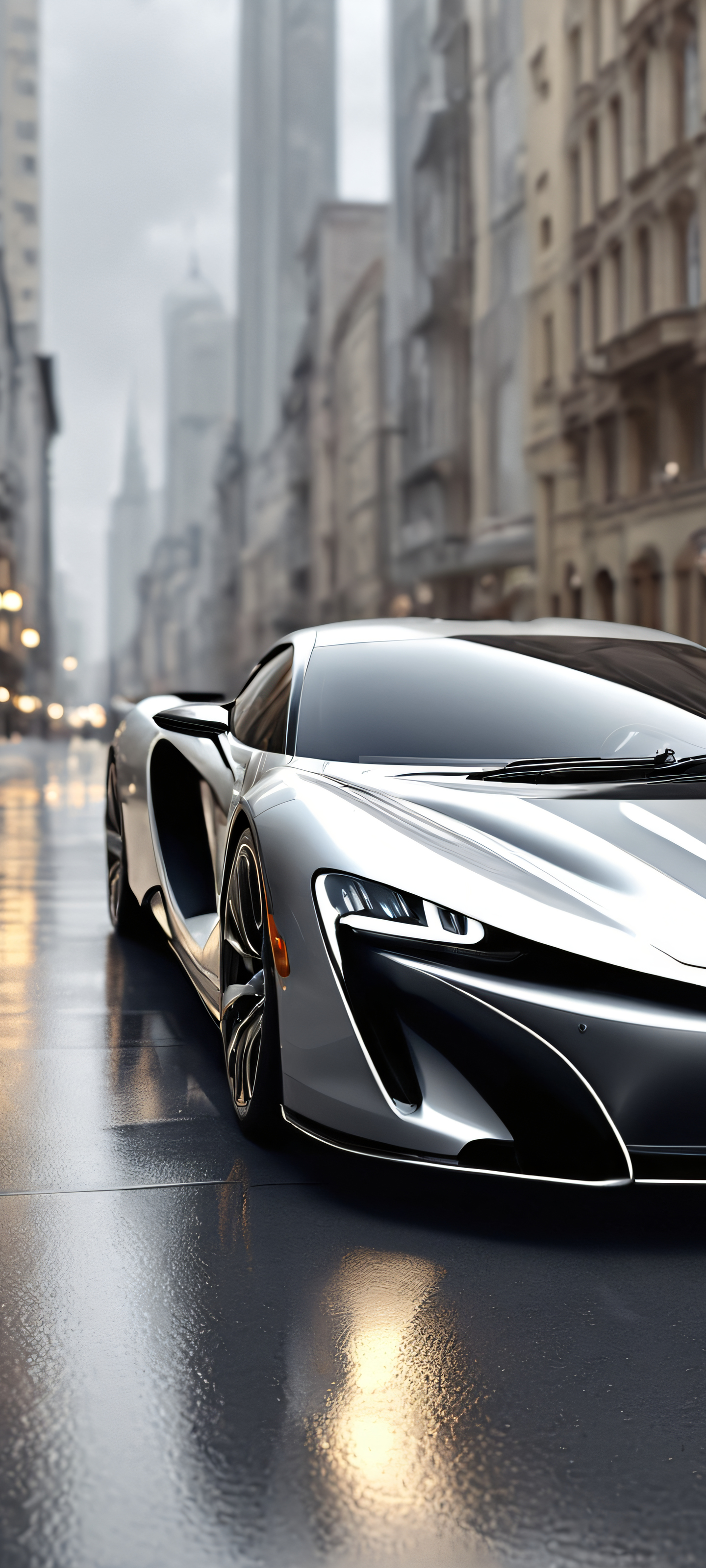Experience the beauty of the city with this 2K QHD masterpiece, optimized for perfect viewing on your iPhone, Samsung Galaxy, or Android home screen. The overcast sky adds a touch of sophistication to the sleek silver car, parked elegantly on the gray asphalt road.