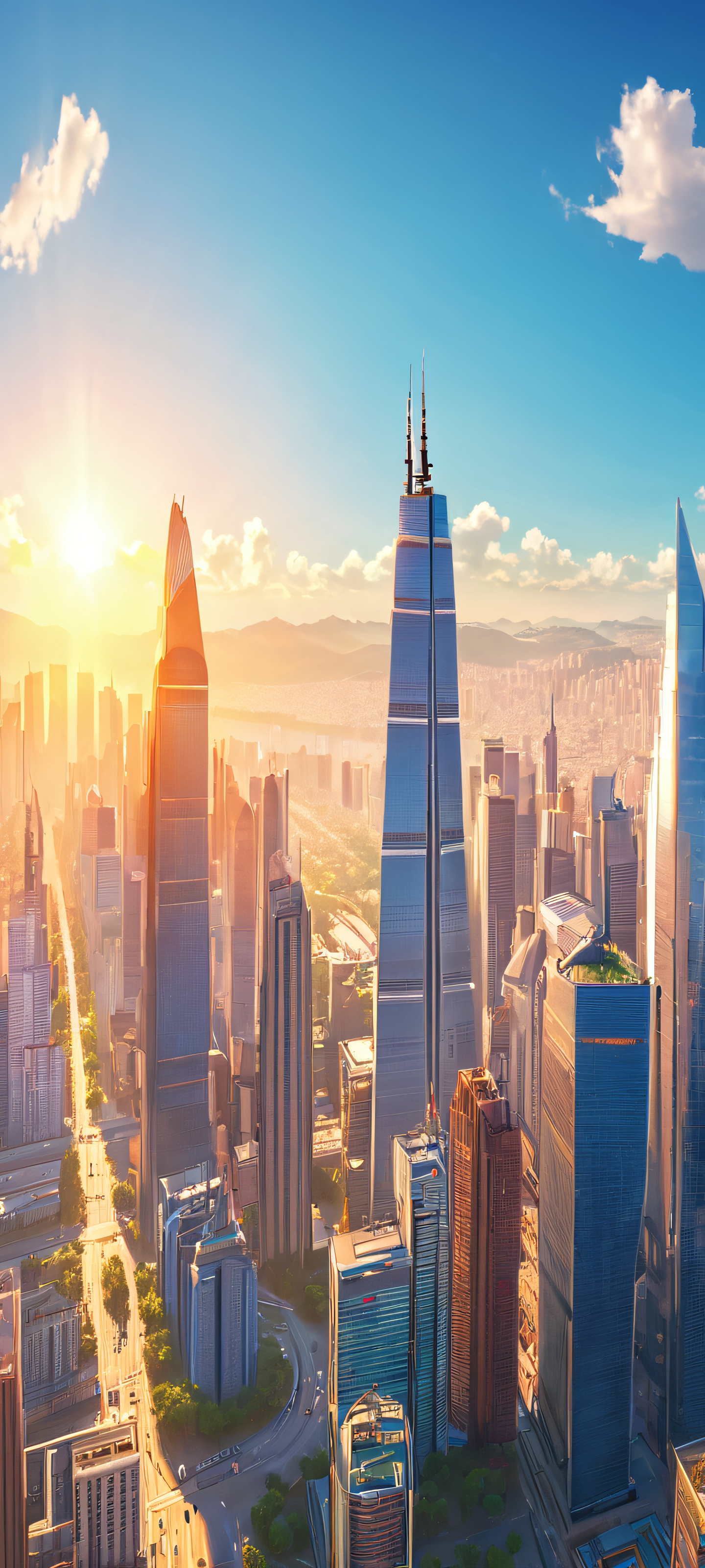 Elevate your mobile experience with this stunning 2K QHD vertical wallpaper. Perfectly optimized for iPhone, Samsung Galaxy, and Android home screens, this masterpiece captures the vibrant colors of a sunny city skyline. Highly detailed and highest quality, this visual treat is sure to amaze.