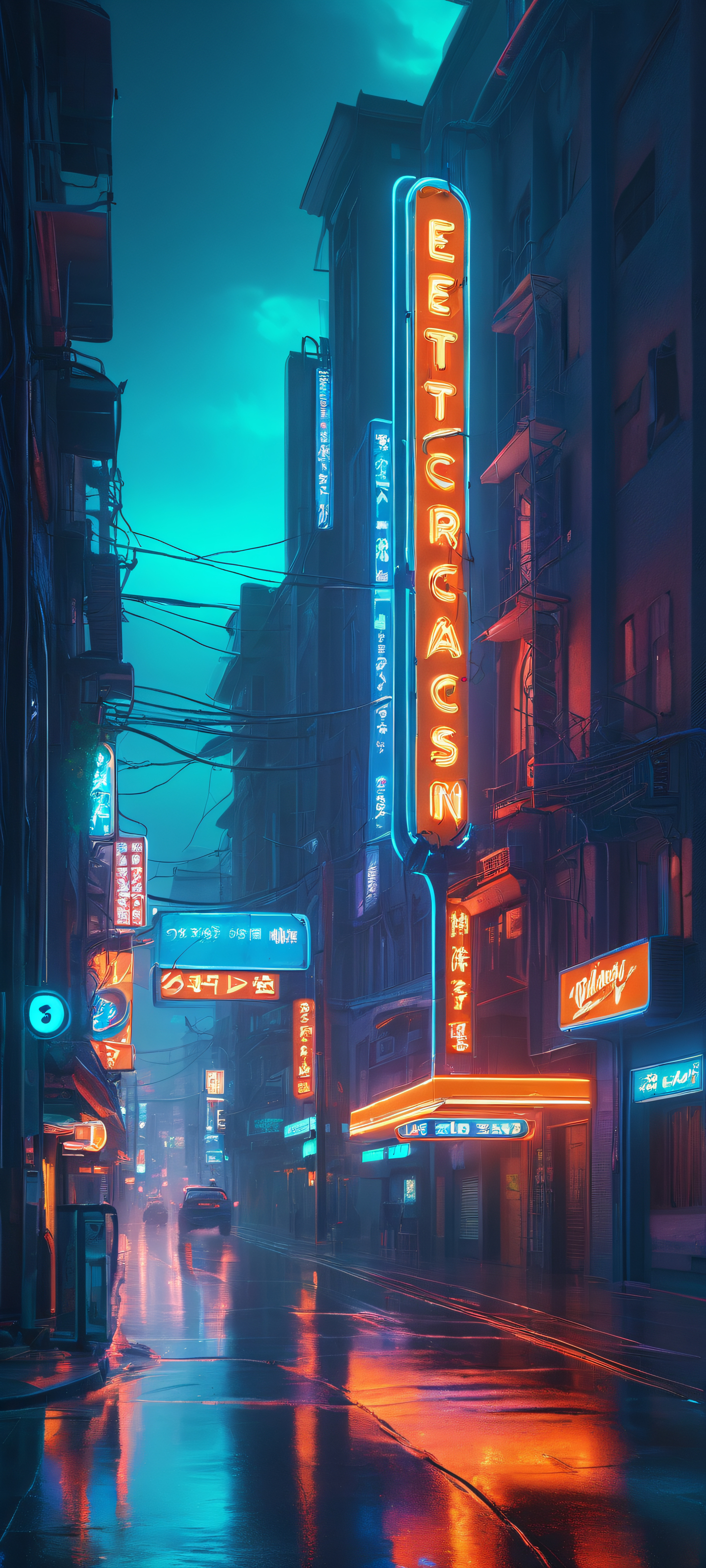 Elevate your mobile phone’s screen with this breathtaking vertical wallpaper. Perfectly optimized for iPhone, Samsung Galaxy, and Android home screens, this stunning cityscape at dusk is a masterpiece of neon-lit details. Enjoy the mesmerizing blend of electric blue, neon green, and deep orange hues.
