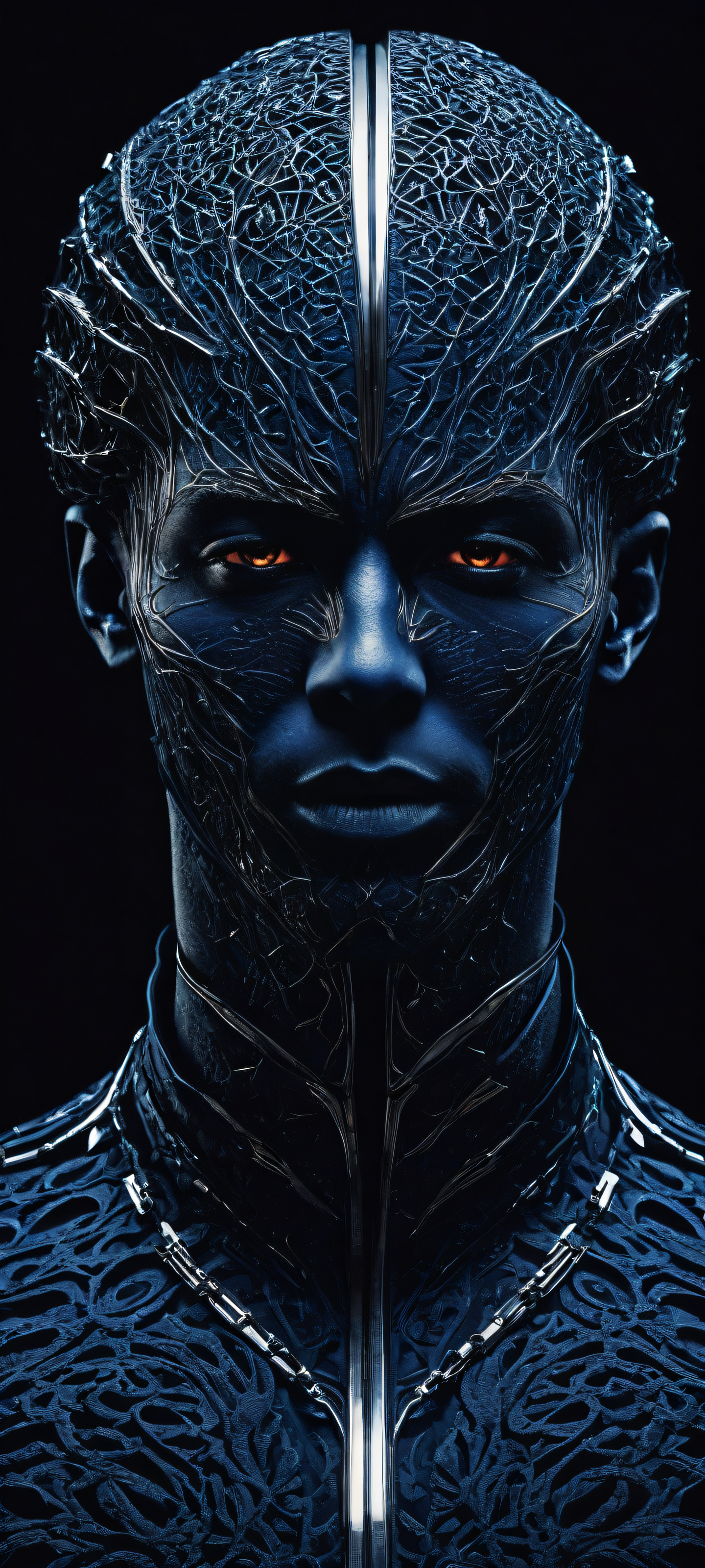 A breathtaking vertical portrait artwork of CK-Shadow-Circuit placed in the lower-middle, intricate micro-details, Perfectly clean and empty top half with vast pure void, set against a dark and minimalist background, Award-winning digital art, pristine clarity, inspired by cksc and dreadmirth-style-art, Dark Mode aesthetic: Deep perfect blacks, striking crisp contrast, and elegant luminescent accents, Dominant palette of deep blues and purples, accented by subtle hints of silver and black, elegant low-key lighting, deep perfect blacks, striking contrast, sleek dark mode aesthetic, luminescent accents, deep rich colors, portrait composition, centered subject in the lower middle, perfectly clean and smooth top half for UI, extreme depth of field blurred background, highly textured surfaces, intricate micro-details, physically based rendering, award-winning digital art, epic breathtaking scale, stunning visual impact, perfect composition, macOS wallpaper aesthetic, masterpiece, 2K QHD resolution, 9:20 aspect ratio.