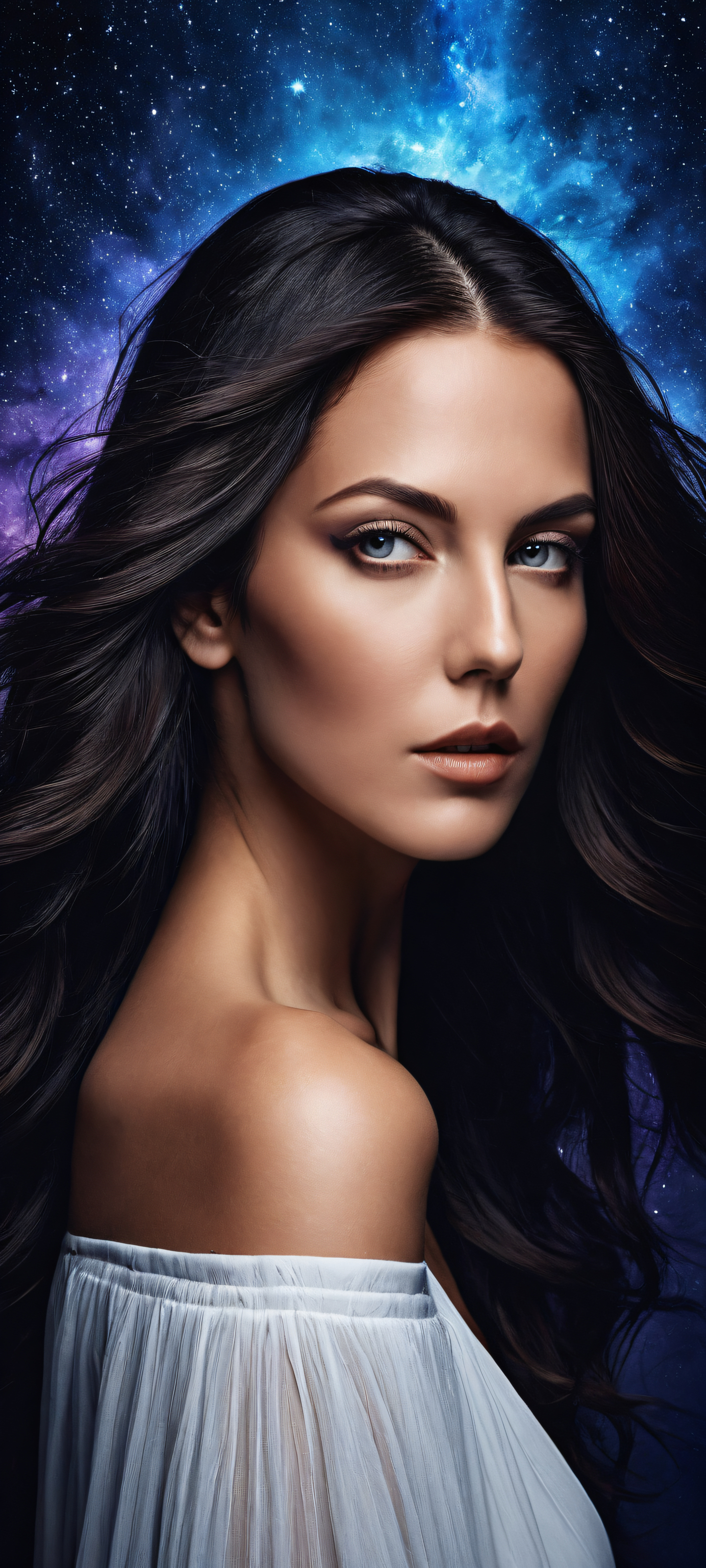 Elevate your mobile experience with this stunning portrait wallpaper. Perfectly optimized for iPhone, Samsung Galaxy, and Android home screens, this masterpiece features Christina Koch’s elegant hair flowing amidst cosmic-inspired elements. Enjoy the sleek Dark Mode aesthetic, deep perfect blacks, striking contrast, and luminescent accents that evoke a sense of wonder.