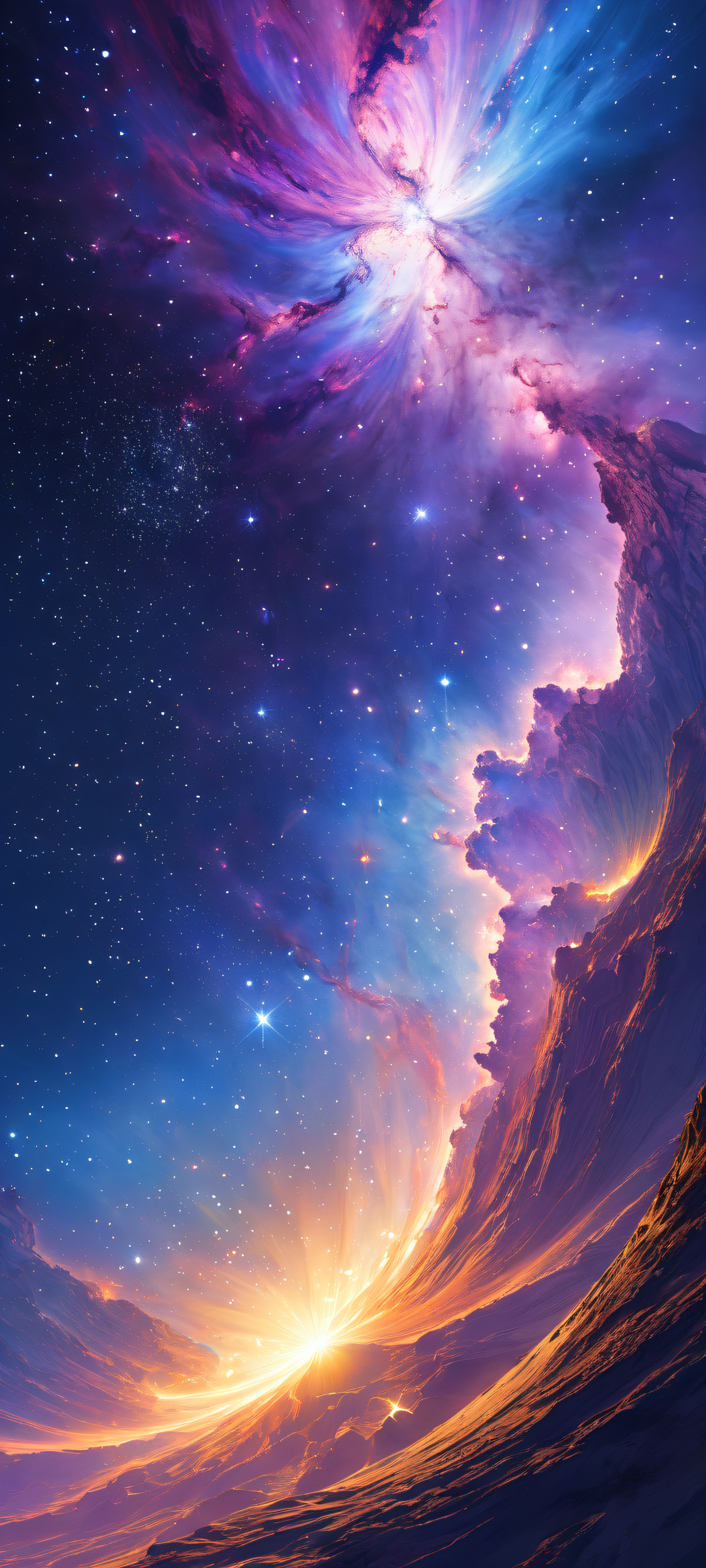 Experience the majesty of the cosmos on your perfectly optimized home screen. This breathtaking digital artwork is tailored for iPhone, Samsung Galaxy, and Android devices, with a stunning vertical portrait composition that transitions seamlessly from a pristine void to an epic cosmic landscape. Witness vibrant stars and galaxies radiating brilliant colors and ray-traced reflections, creating an otherworldly ambiance that evokes mystery and wonder.