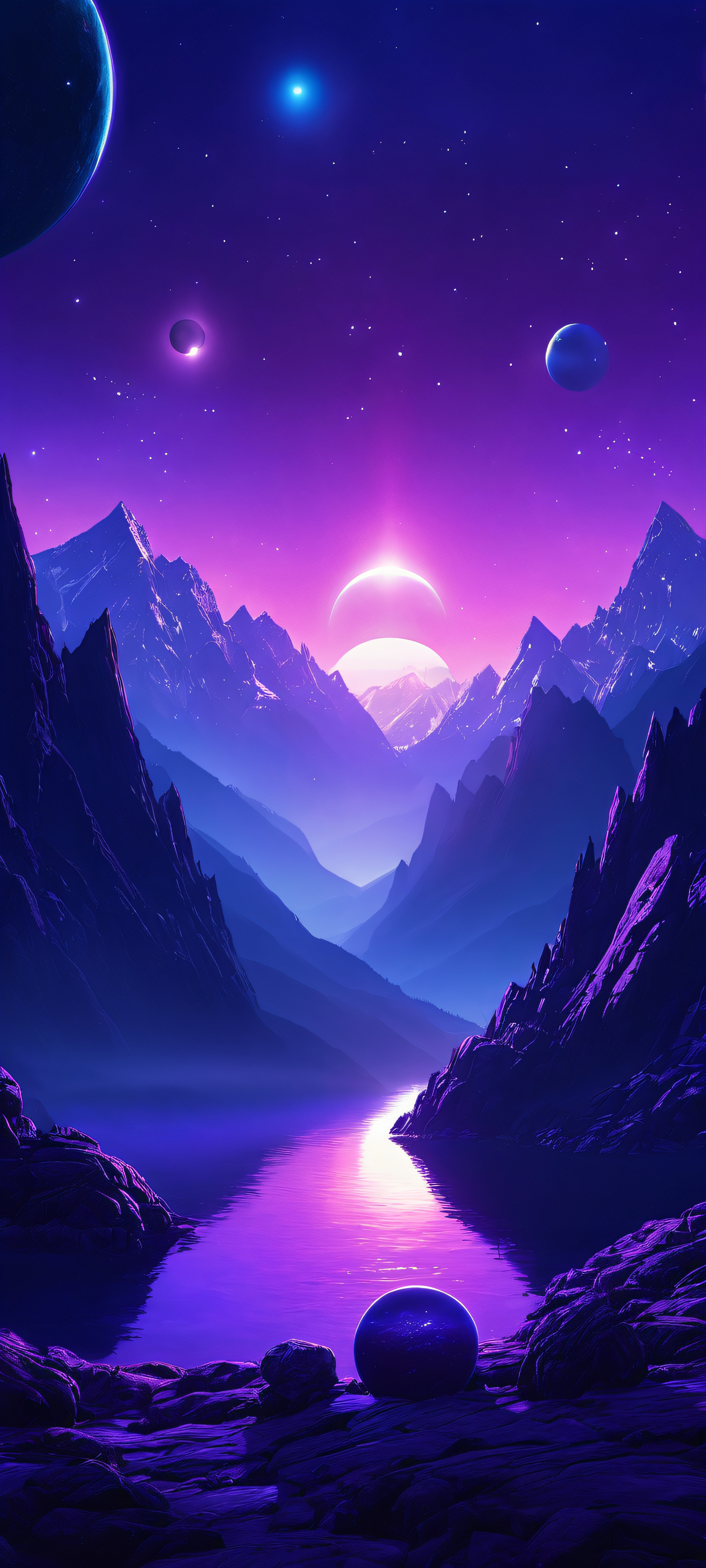 Elevate your mobile experience with this stunning cosmic masterpiece. This 2K QHD resolution wallpaper is meticulously designed to be perfectly optimized for iPhone, Samsung Galaxy, and Android home screens. Let the mesmerizing orbs and dark mountains transport you to a new dimension of tranquility and wonder.
