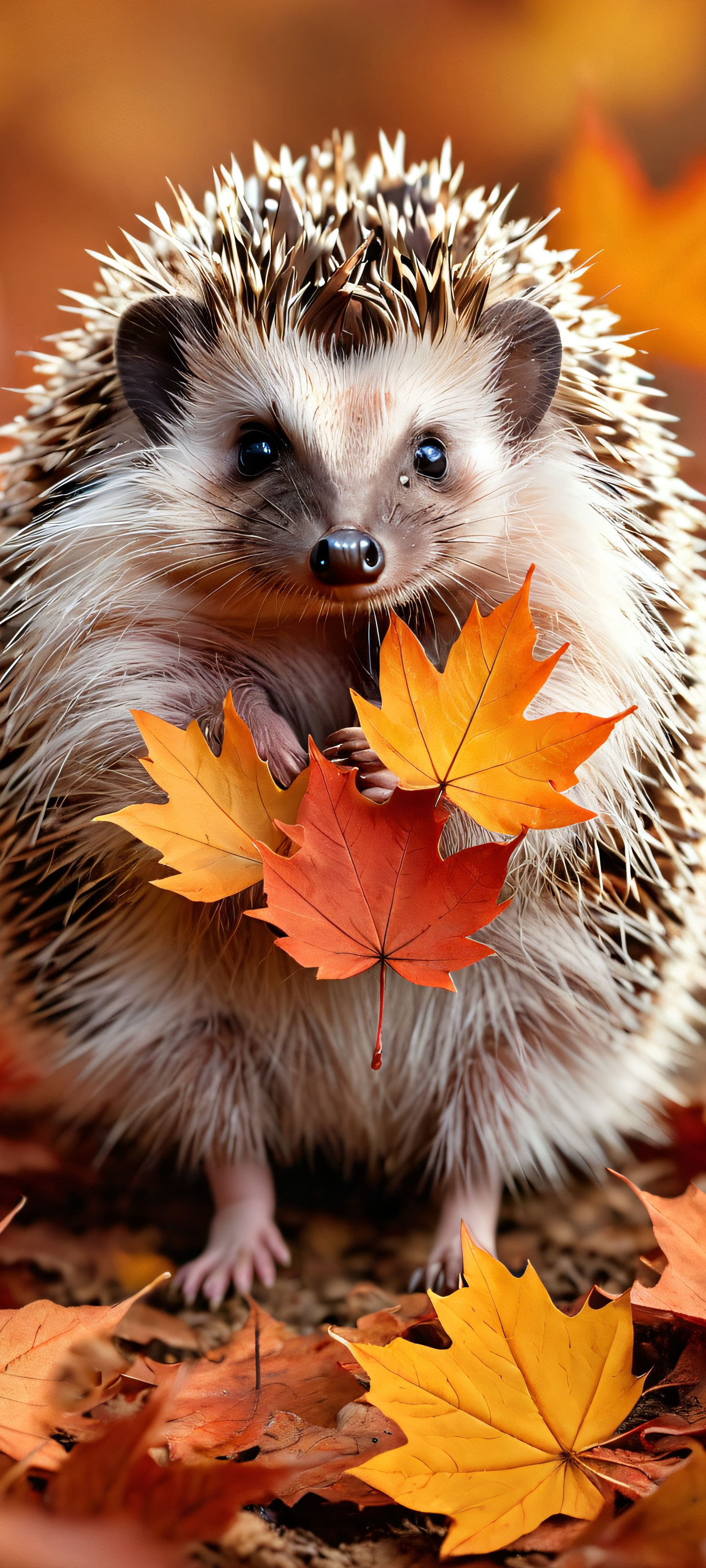 A heartwarming image of a hedgehog surrounded by fall leaves on an iPhone or Android phone's home screen.