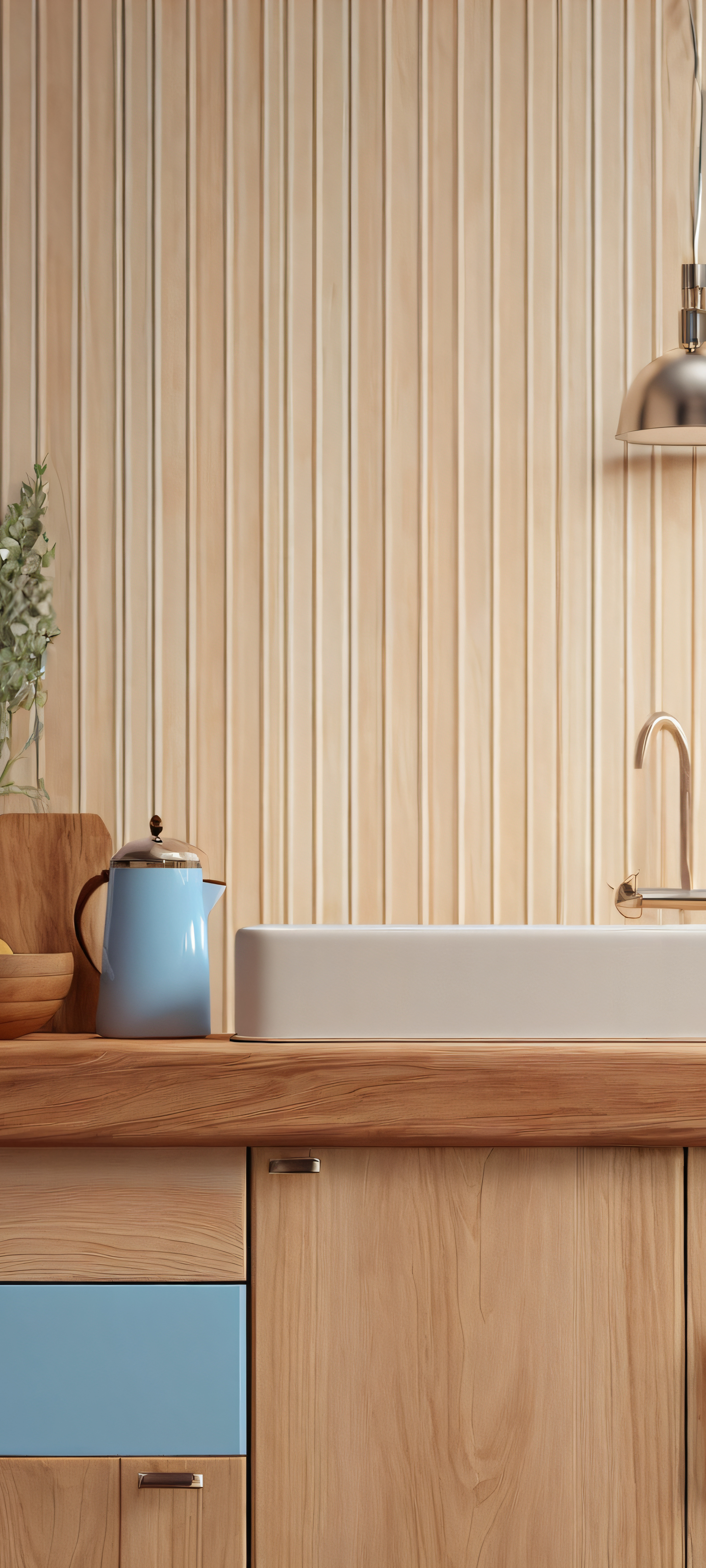 Transform your mobile home screen with this stunning kitchen wallpaper, perfectly optimized for iPhone, Samsung Galaxy, and Android devices. The warm wooden tones and soft blue hues evoke a cozy atmosphere, making it the perfect addition to your daily commute or home screen.