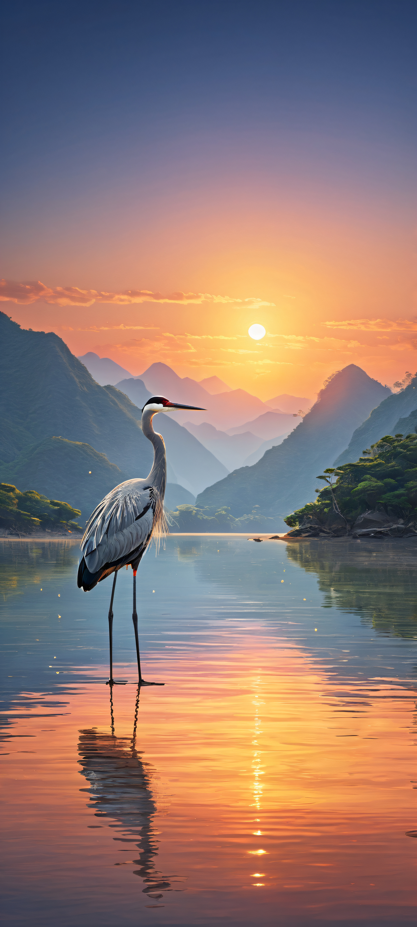 A breathtaking vertical portrait artwork of Cranes placed in the lower-middle, intricate micro-details of Asian clothing and shallow water, Perfectly clean and empty top half with vast pure void, gradually transitioning to a serene river at dusk, Award-winning digital art, stunning visual impact, and pristine clarity, Ethereal lighting with radiant colors, ray-traced reflections, and pristine clarity, capturing the warmth of the setting sun, #C9F7F5 #FFC499 #34A85A #8B9467, ethereal lighting, radiant, brilliant colors, ray traced reflections, pristine clarity, portrait composition, centered subject in the lower middle, perfectly clean and smooth top half for UI, extreme depth of field blurred background, highly textured surfaces, intricate micro-details, physically based rendering, award-winning digital art, epic breathtaking scale, stunning visual impact, perfect composition, macOS wallpaper aesthetic, masterpiece, 2K QHD resolution, 9:20 aspect ratio.