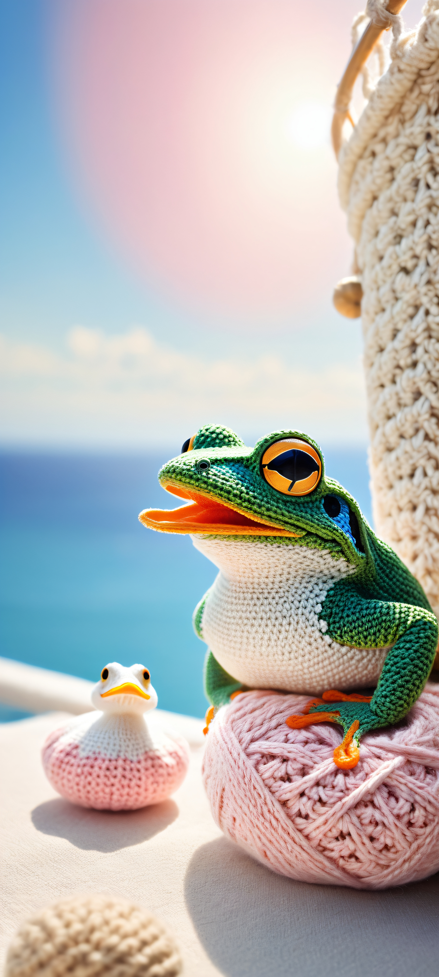 A beautifully crafted crocheted frog and duck duo sitting on the tip of a ship, perfectly optimized for iPhone/Android home screens.