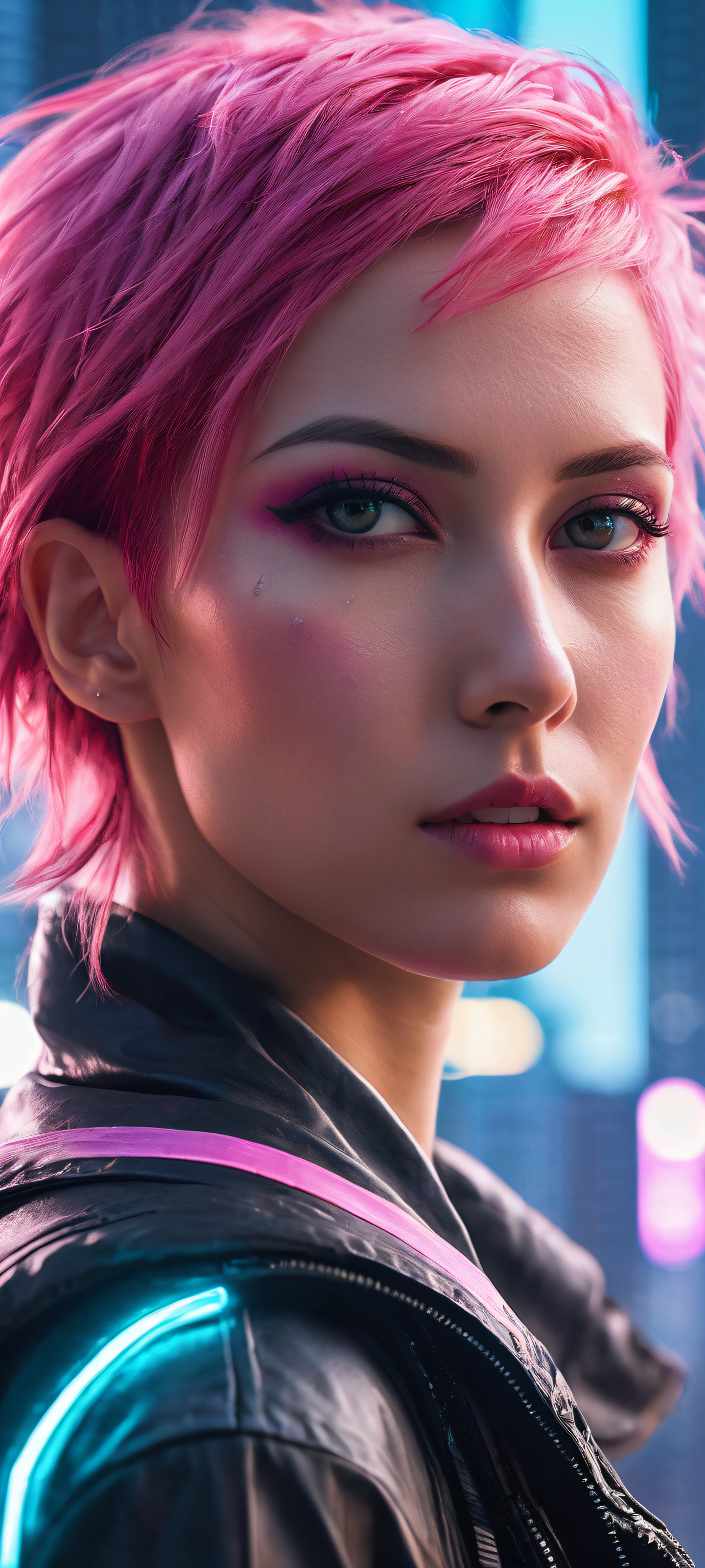 Step into this breathtaking digital art masterpiece, perfectly optimized for your iPhone, Samsung Galaxy, or Android home screen. This stunning vertical portrait features an award-winning artwork of a cyberpunk girl with pink hair, situated in the lower-middle amidst a futuristic cityscape with neon lights and towering skyscrapers. Enjoy the ethereal lighting, brilliant colors, and ray-traced reflections that create a sense of depth and visual impact.