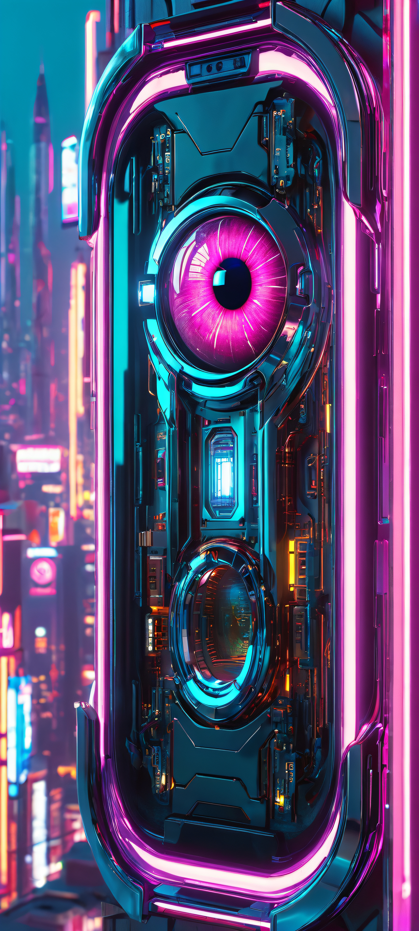 A stunning robotic eye set against a neon-lit cyberpunk cityscape, perfectly optimized for iPhone and Android home screens.