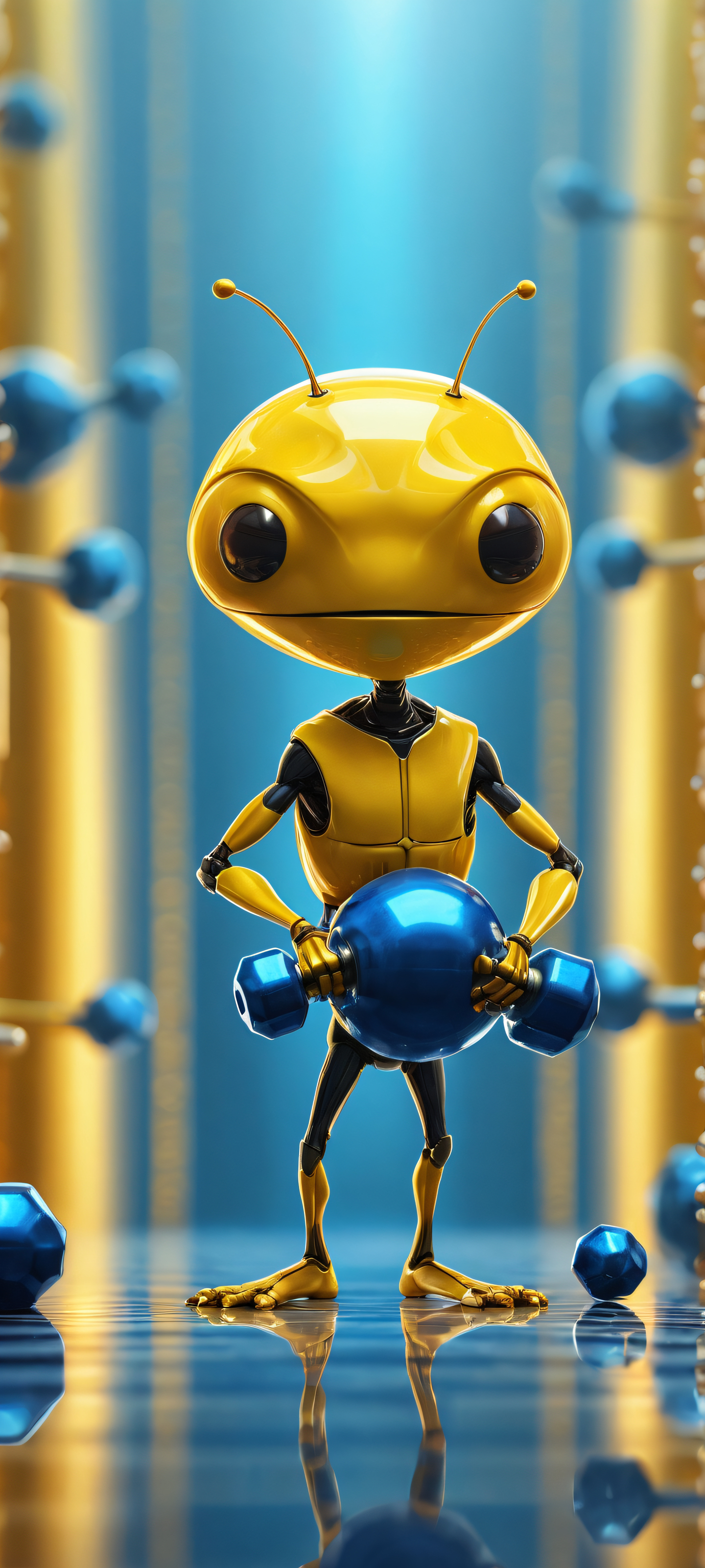 A breathtaking vertical portrait artwork of Ant Lifting Tiny Dumbbell Placed In The Lower-Middle With Insane Micro-Details, Extreme Depth of Field, Perfectly Clean and Empty Top Half with Vast Pure Void, Miniature Gym in the Middle, Award-Winning Digital Art, Stunning Visual Impact, Pristine Clarity, Ethereal Lighting: Radiant, Brilliant Colors, Ray Traced Reflections, Pristine Clarity, Bright and Airy, Dominant Palette of Vibrant Yellows, Deep Blues, and Metallic Silvers, Reflecting Fun and Humor, ethereal lighting, radiant, brilliant colors, ray traced reflections, pristine clarity, portrait composition, centered subject in the lower middle, perfectly clean and smooth top half for UI, extreme depth of field blurred background, highly textured surfaces, intricate micro-details, physically based rendering, award-winning digital art, epic breathtaking scale, stunning visual impact, perfect composition, macOS wallpaper aesthetic, masterpiece, 2K QHD resolution, 9:20 aspect ratio.