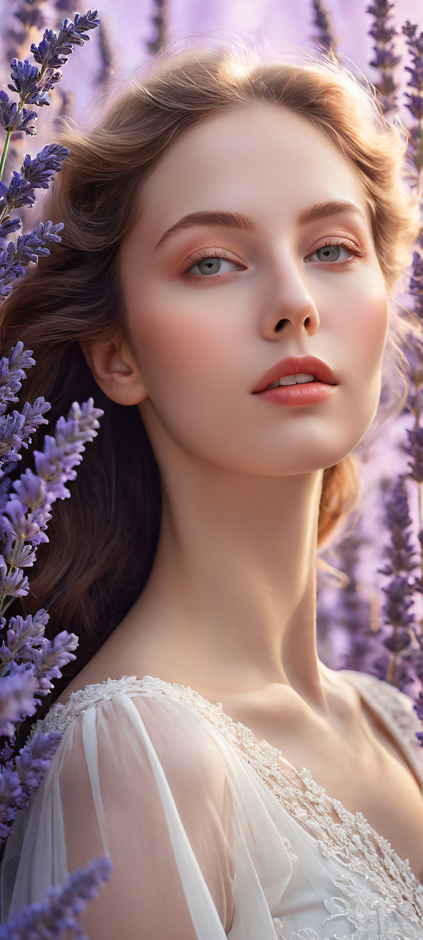 A breathtaking vertical portrait artwork of Aurora Bloom placed in the lower-middle, intricate micro-details, Perfectly clean and empty top half with vast pure void, a canvas for UI widgets, Award-winning digital art, stunning visual impact with pristine clarity, Ätherisch, radiant lighting with brilliant colors, ray traced reflections, and flawless clarity, [‘Soft Peach’, ‘Misty Lavender’, ‘Creamy Ivory’], ethereal lighting, radiant, brilliant colors, ray traced reflections, pristine clarity, portrait composition, centered subject in the lower middle, perfectly clean and smooth top half for UI, extreme depth of field blurred background, highly textured surfaces, intricate micro-details, physically based rendering, award-winning digital art, epic breathtaking scale, stunning visual impact, perfect composition, macOS wallpaper aesthetic, masterpiece, 2K QHD resolution, 9:20 aspect ratio.