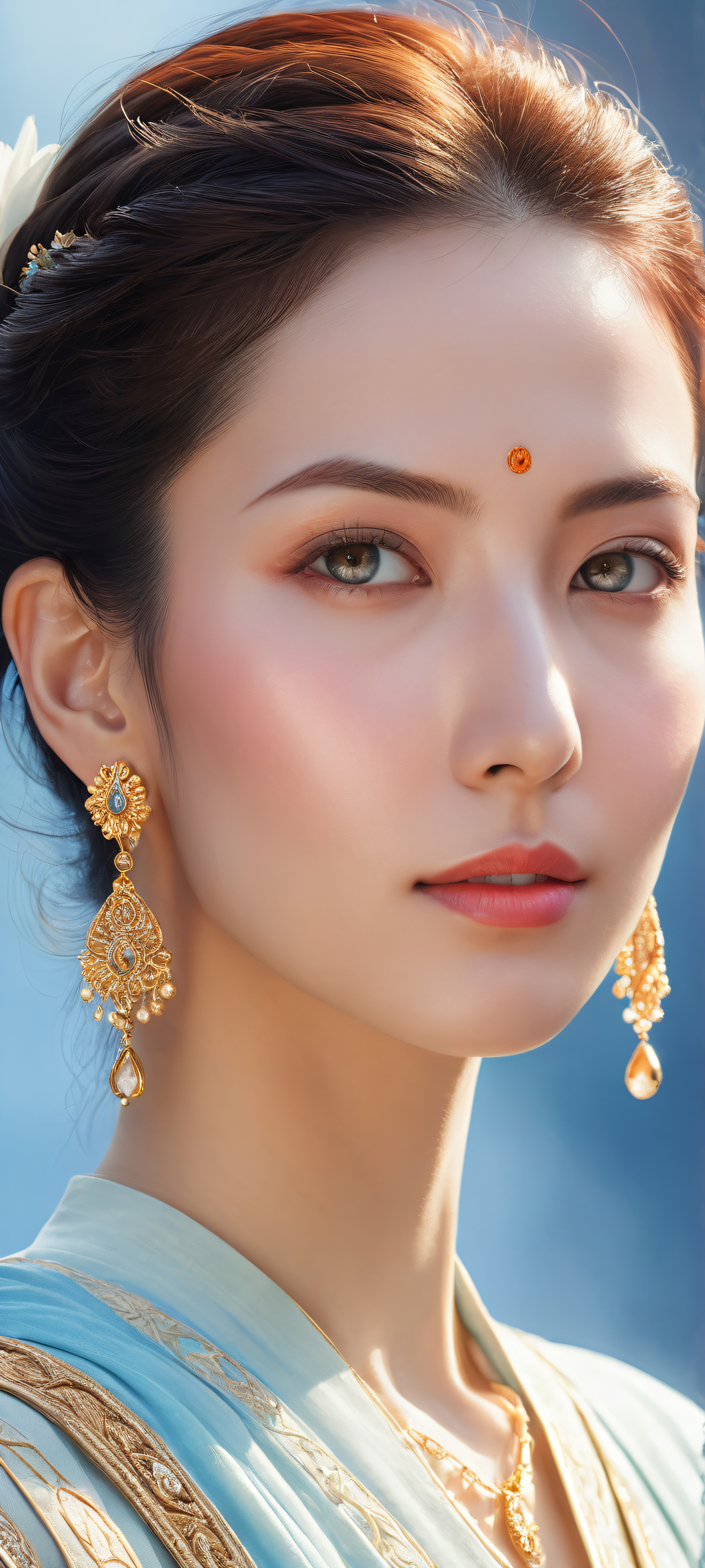 A breathtaking vertical portrait artwork of Video game characters placed in the lower-middle with intricate micro-details of their short hair and earrings., Perfectly clean and empty top half with vast pure void, allowing for a seamless blend with UI widgets, Award-winning digital art, stunning visual impact, and pristine clarity. A true masterpiece., Ethereal lighting casting brilliant colors and ray-traced reflections, creating an air of serenity and wonder, Pastel hues of soft blues and whites, evoking the feeling of dawn breaking over a peaceful landscape, ethereal lighting, radiant, brilliant colors, ray traced reflections, pristine clarity, portrait composition, centered subject in the lower middle, perfectly clean and smooth top half for UI, extreme depth of field blurred background, highly textured surfaces, intricate micro-details, physically based rendering, award-winning digital art, epic breathtaking scale, stunning visual impact, perfect composition, macOS wallpaper aesthetic, masterpiece, 2K QHD resolution, 9:20 aspect ratio.