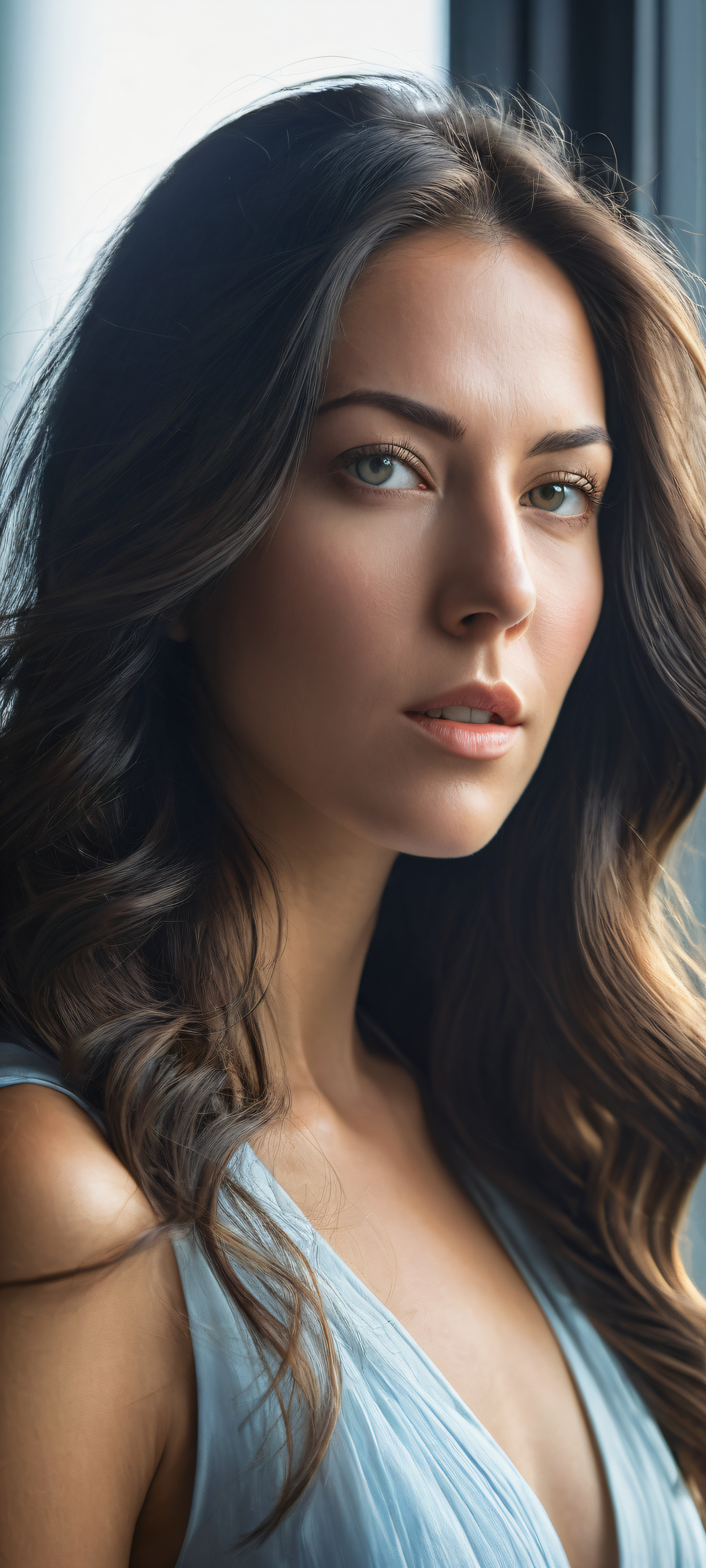 A breathtaking vertical portrait artwork of Christina Koch placed in the lower-middle with insane micro-details on her long hair, Perfectly clean and empty top half with vast pure void, contrasted by a dark background window scene from Artemis 2 mission, Award-winning digital art with stunning visual impact and pristine clarity, Ethereal lighting with radiant colors and ray-traced reflections, capturing the essence of a bright and airy atmosphere, [‘Soft Pastel Blues (#C5E1F7), Celestial Whites (#FFFFFF), Dark Space Grays (#333333)’], ethereal lighting, radiant, brilliant colors, ray traced reflections, pristine clarity, portrait composition, centered subject in the lower middle, perfectly clean and smooth top half for UI, extreme depth of field blurred background, highly textured surfaces, intricate micro-details, physically based rendering, award-winning digital art, epic breathtaking scale, stunning visual impact, perfect composition, macOS wallpaper aesthetic, masterpiece, 2K QHD resolution, 9:20 aspect ratio.