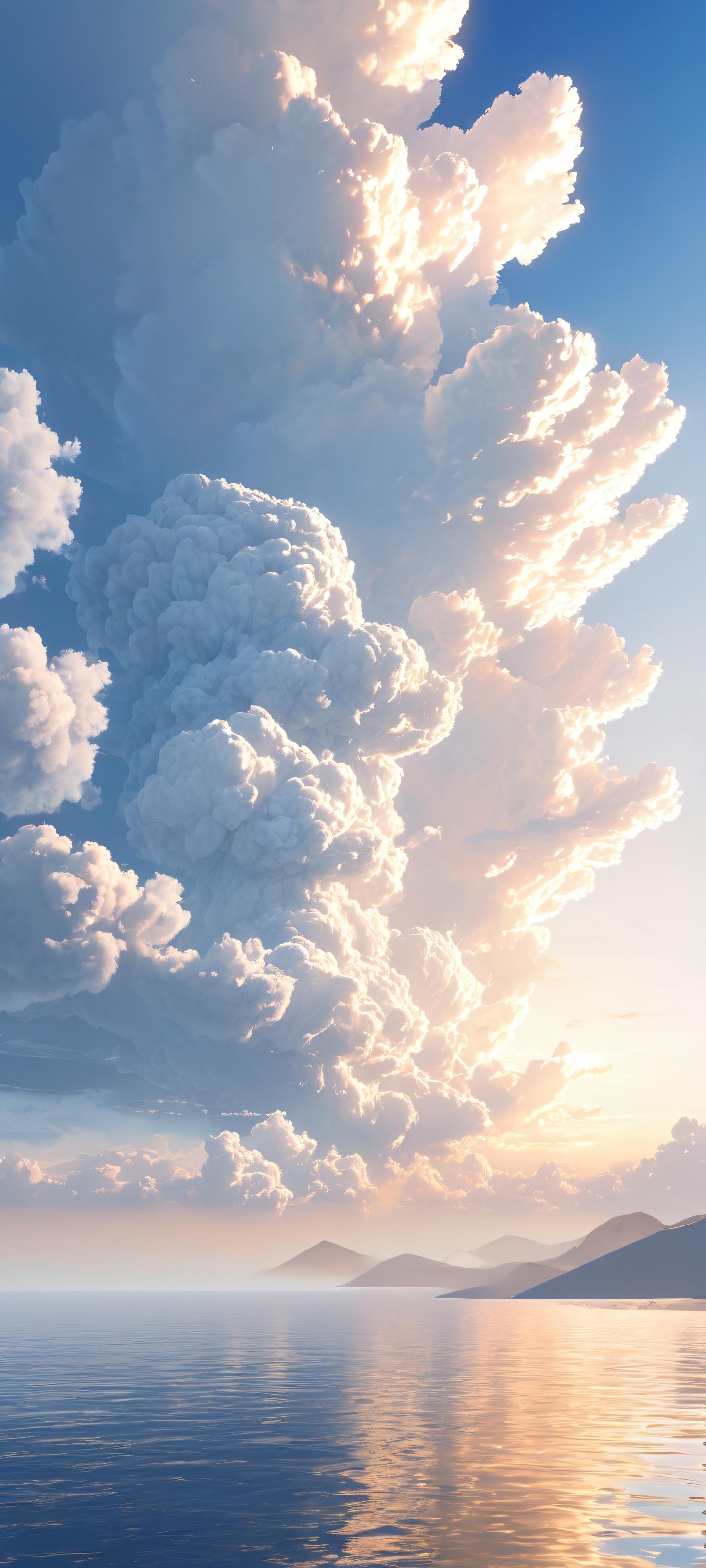Adorn your iPhone, Samsung Galaxy, or Android home screen with this breathtaking vertical portrait artwork. Delicate cloud formations are placed in the lower-middle, showcasing intricate details and transitioning to a pristine top half with vast void, gradually filling with soft clouds. The ethereal lighting casts a warm glow, accompanied by subtle ray-traced reflections.