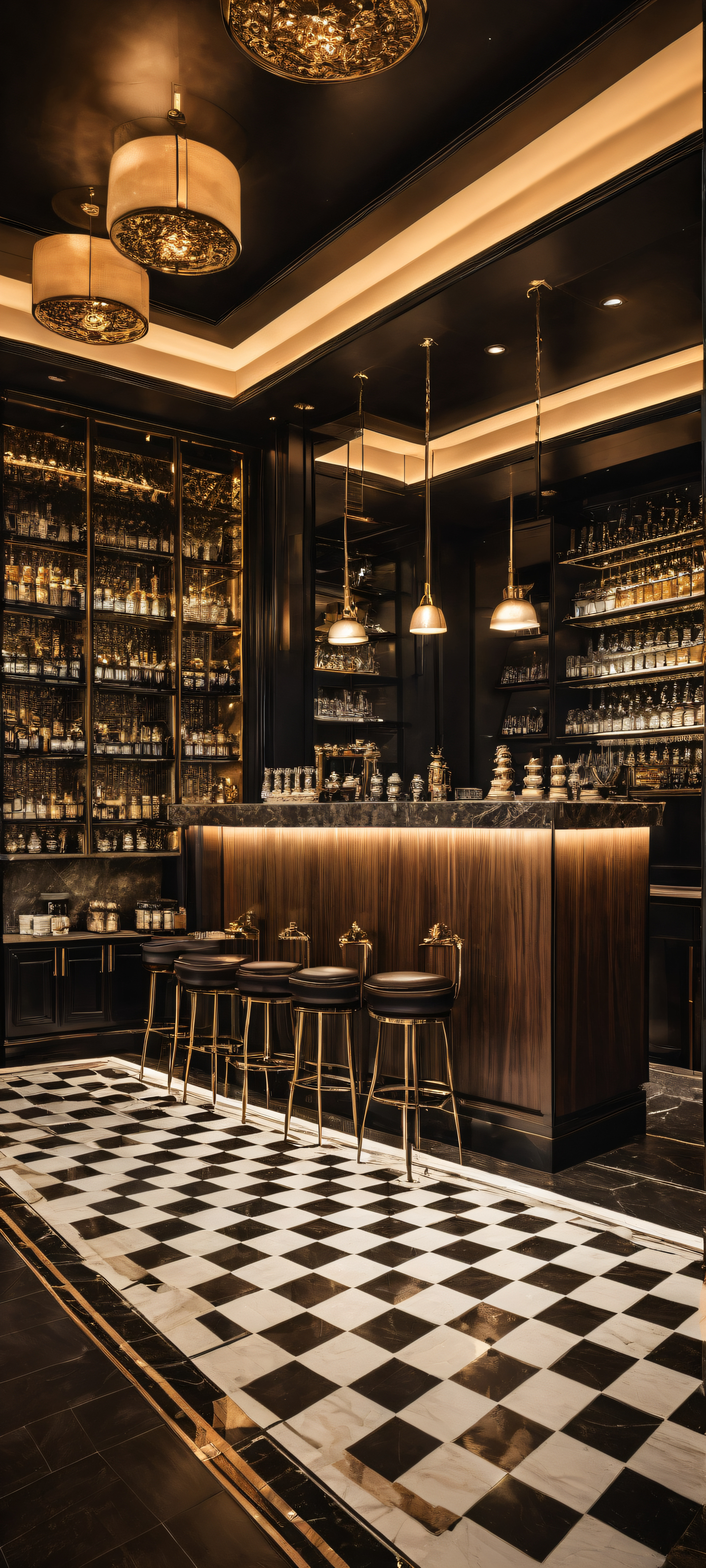 A breathtaking vertical portrait artwork of A grand coffee bar placed in the lower-middle with intricate micro-details such as chess pieces and delicate cups., Perfectly clean and empty top half with vast pure void, contrasting with the detailed interior below. A sleek, modern room sets the backdrop for this masterpiece., Award-winning digital art, pristine clarity, stunning visual impact, and a touch of elegance., Dark mode aesthetic with deep perfect blacks, striking crisp contrast, and elegant luminescent accents emanating from subtle LED strips above the coffee bar., Dominant color palette featuring rich browns, creamy whites, and metallic tones, evoking the warmth and sophistication of a high-end coffee culture., elegant low-key lighting, deep perfect blacks, striking contrast, sleek dark mode aesthetic, luminescent accents, deep rich colors, portrait composition, centered subject in the lower middle, perfectly clean and smooth top half for UI, extreme depth of field blurred background, highly textured surfaces, intricate micro-details, physically based rendering, award-winning digital art, epic breathtaking scale, stunning visual impact, perfect composition, macOS wallpaper aesthetic, masterpiece, 2K QHD resolution, 9:20 aspect ratio.