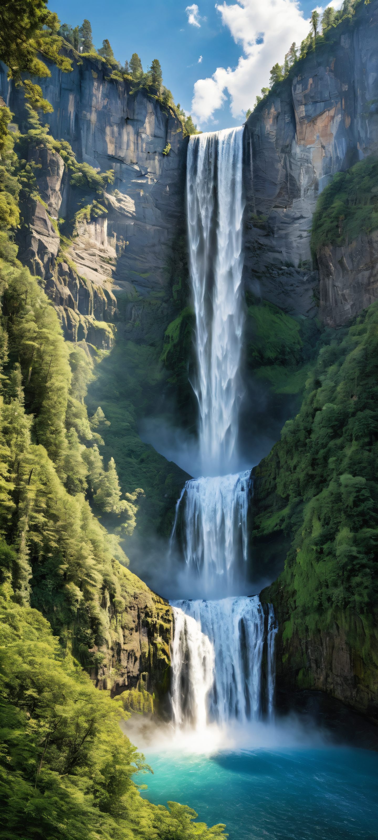 A breathtaking vertical portrait artwork of Waterfall placed in the lower-middle with intricate micro-details, showcasing the majesty of nature’s wonder., Perfectly clean and empty top half with vast pure void, gradually transitioning into a majestic mountainous landscape, culminating in the awe-inspiring waterfall scene below., Award-winning digital art, pristine clarity, and stunning visual impact, blending Maël Martin’s unique style with breathtaking landscape illustration., Ethereal lighting radiates from the clouds above, casting brilliant rays that reflect off the water’s surface, creating an otherworldly ambiance., Dominant hues of misty blue, ethereal whites, and radiant golds, evoking a sense of serenity and wonder., ethereal lighting, radiant, brilliant colors, ray traced reflections, pristine clarity, portrait composition, centered subject in the lower middle, perfectly clean and smooth top half for UI, extreme depth of field blurred background, highly textured surfaces, intricate micro-details, physically based rendering, award-winning digital art, epic breathtaking scale, stunning visual impact, perfect composition, macOS wallpaper aesthetic, masterpiece, 2K QHD resolution, 9:20 aspect ratio.