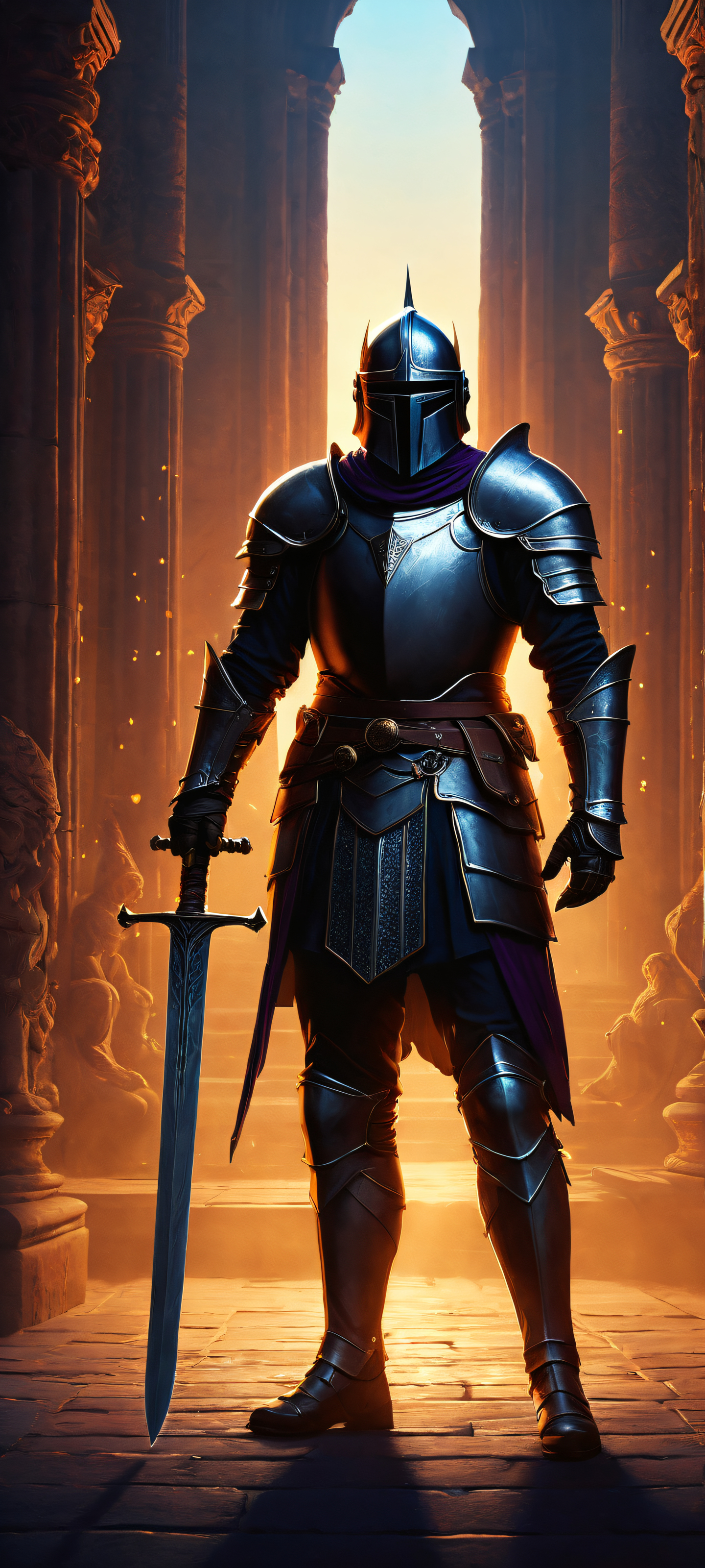 A breathtaking vertical portrait artwork of A majestic knight, placed in the lower-middle with insane micro-details, standing amidst a sea of intricate mouse silhouettes., The perfect backdrop is a perfectly clean and empty top half with vast pure void, allowing for seamless UI breathing space., Award-winning digital art, pristine clarity, and stunning visual impact. Inspired by Chris Falkenberg’s signature style on ArtStation., Deep, rich low light with a hint of luminescent accents, accentuating the subject while maintaining the sleek dark mode aesthetic., Dominant palette features a mix of deep blues and purples, punctuated by warm golden highlights from the sun rays, evoking an air of mystery and adventure., elegant low-key lighting, deep perfect blacks, striking contrast, sleek dark mode aesthetic, luminescent accents, deep rich colors, portrait composition, centered subject in the lower middle, perfectly clean and smooth top half for UI, extreme depth of field blurred background, highly textured surfaces, intricate micro-details, physically based rendering, award-winning digital art, epic breathtaking scale, stunning visual impact, perfect composition, macOS wallpaper aesthetic, masterpiece, 2K QHD resolution, 9:20 aspect ratio.