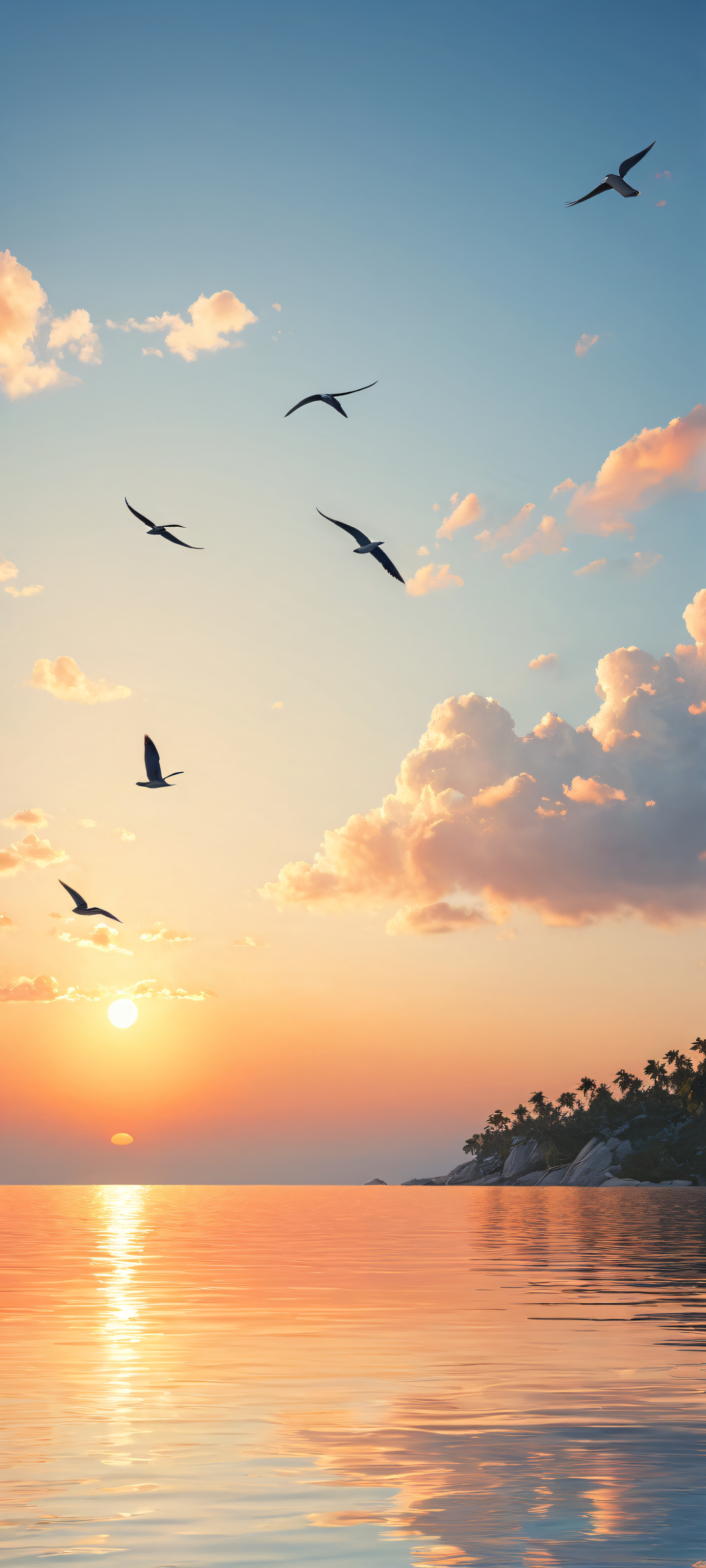 A breathtaking vertical portrait artwork of Birds placed in the lower-middle with intricate micro-details of their wings and feathers., Perfectly clean and empty top half with vast pure void, gradually transitioning to a serene landscape featuring fluffy clouds and a simple background of water and sky., Award-winning digital art, pristine clarity, and stunning visual impact. Inspired by Apple UI level designs., Ethereal sunset glow with radiant colors and subtle ray-traced reflections, casting a warm and inviting ambiance., A palette of soft blues, gentle oranges, and creamy whites, evoking a sense of calmness and serenity., ethereal lighting, radiant, brilliant colors, ray traced reflections, pristine clarity, portrait composition, centered subject in the lower middle, perfectly clean and smooth top half for UI, extreme depth of field blurred background, highly textured surfaces, intricate micro-details, physically based rendering, award-winning digital art, epic breathtaking scale, stunning visual impact, perfect composition, macOS wallpaper aesthetic, masterpiece, 2K QHD resolution, 9:20 aspect ratio.