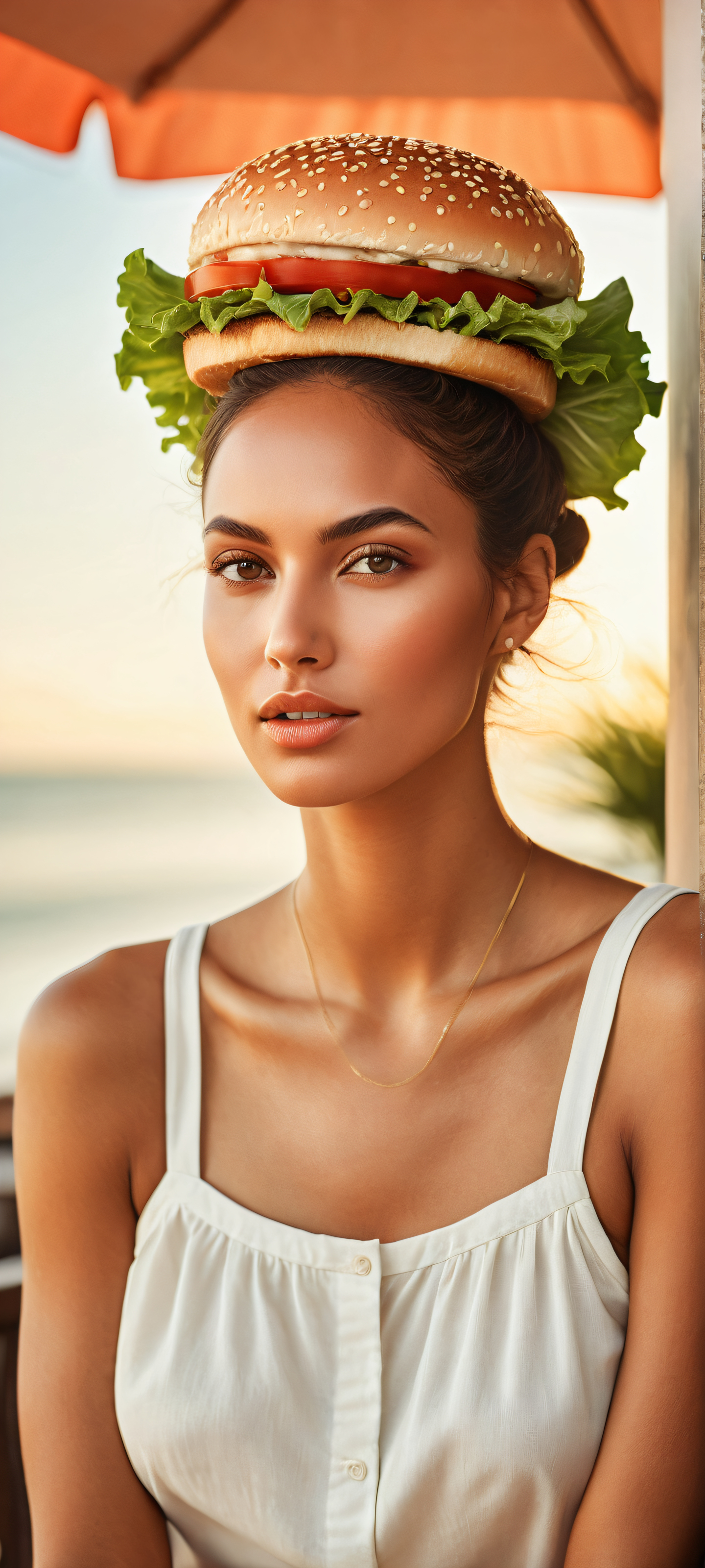 A breathtaking vertical portrait artwork of A stunning hamburger woman, placed in the lower-middle with insane micro-details showcasing intricate bun textures, lettuce fronds, and tomato seeds., Perfectly clean and empty top half with vast pure void, allowing for infinite perspective and depth. In the background, a subtle hint of restaurant ambiance, such as faint sounds of sizzling meat or gentle chatter., Award-winning digital art, stunning visual impact, and pristine clarity., Ethereal lighting with soft, radiant colors that evoke a sense of elegance and sophistication. The hamburger woman is bathed in an warm, golden glow, while the surrounding environment is illuminated by a series of delicate, wispy highlights., The dominant color palette features a combination of rich, earthy tones such as terracotta reds, creamy whites, and subtle green undertones, evoking the feeling of a sunny day at the beach or a cozy dinner at a upscale restaurant., ethereal lighting, radiant, brilliant colors, ray traced reflections, pristine clarity, portrait composition, centered subject in the lower middle, perfectly clean and smooth top half for UI, extreme depth of field blurred background, highly textured surfaces, intricate micro-details, physically based rendering, award-winning digital art, epic breathtaking scale, stunning visual impact, perfect composition, macOS wallpaper aesthetic, masterpiece, 2K QHD resolution, 9:20 aspect ratio.