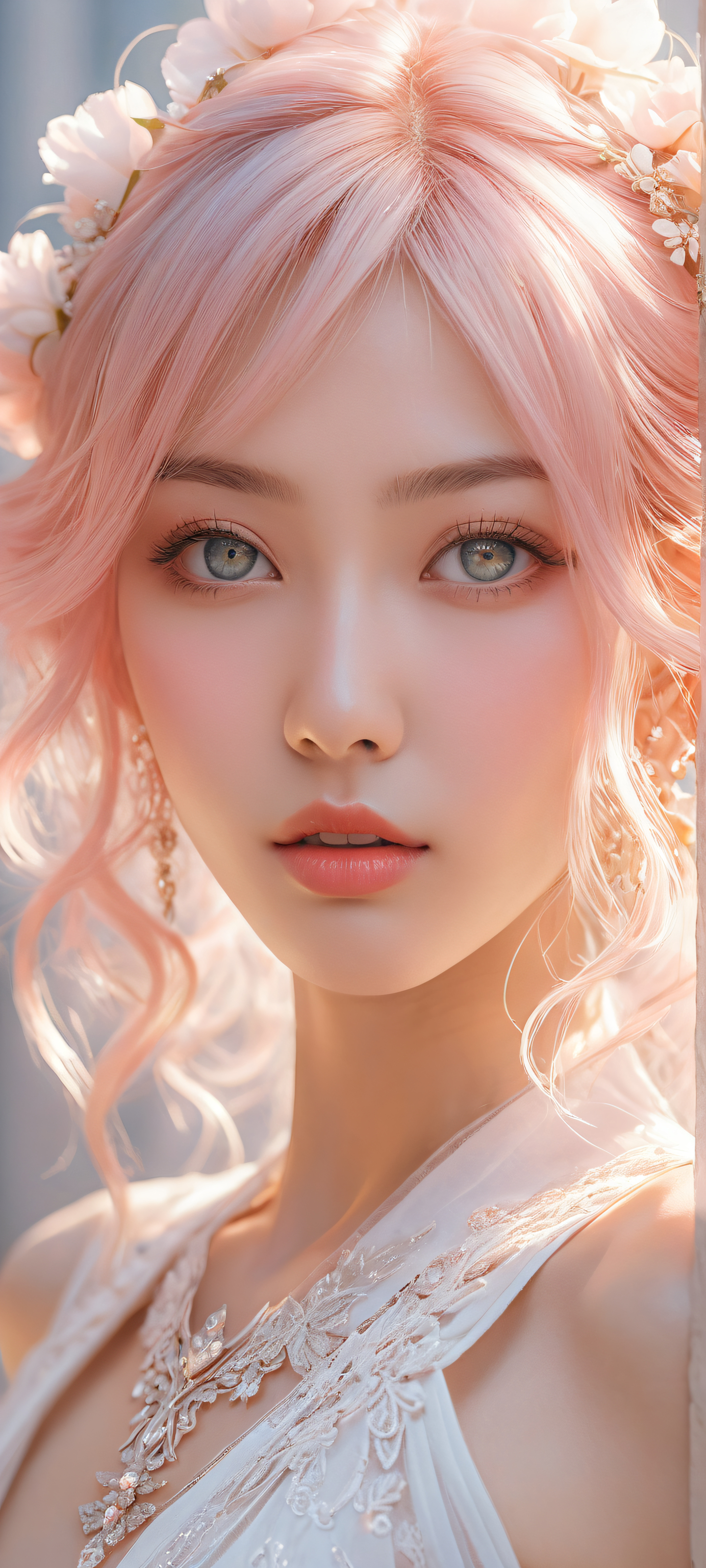 A breathtaking vertical portrait artwork of A stunning anime girl placed in the lower-middle with insane micro-details, intricate facial expressions and clothing textures., A perfectly clean and empty top half with vast pure void, allowing for seamless integration with iOS UI widgets., Award-winning digital art with pristine clarity, showcasing stunning visual impact and a perfect blend of realism and fantasy., Ethereal lighting with radiant, brilliant colors, ray-traced reflections, and impeccable clarity, creating an airy and dreamy atmosphere., Pastel pink, soft peach, and creamy white hues, evoking a sense of wonder and enchantment., ethereal lighting, radiant, brilliant colors, ray traced reflections, pristine clarity, portrait composition, centered subject in the lower middle, perfectly clean and smooth top half for UI, extreme depth of field blurred background, highly textured surfaces, intricate micro-details, physically based rendering, award-winning digital art, epic breathtaking scale, stunning visual impact, perfect composition, macOS wallpaper aesthetic, masterpiece, 2K QHD resolution, 9:20 aspect ratio.