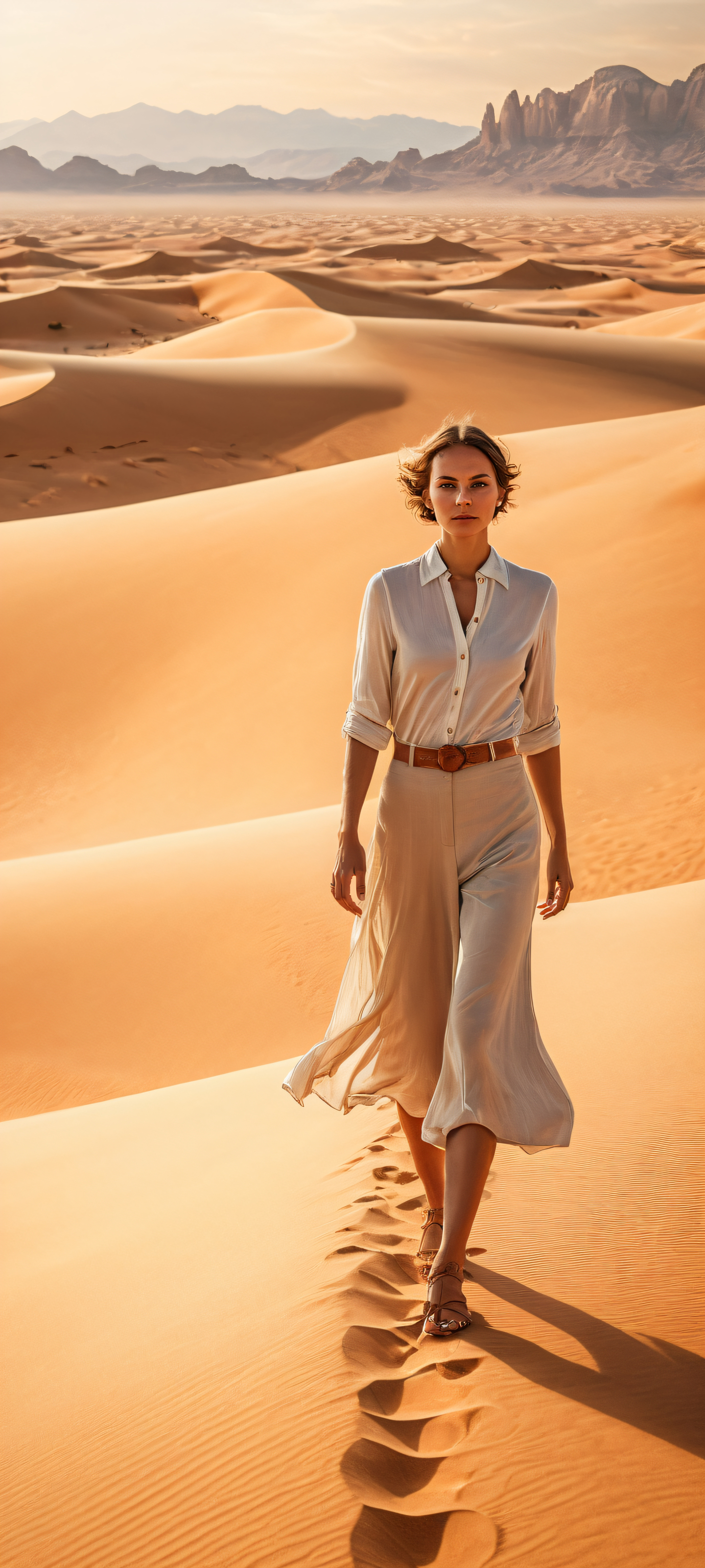 Step into the shoes of a fearless adventurer with this stunning digital artwork, perfekt optimiert für Ihr iPhone, Samsung Galaxy, oder Android-Startbildschirm. The beautifully rendered portrait of a 1930s female explorer is set against an epic backdrop of ancient rock formations and endless dunes, evoking a sense of limitless exploration.