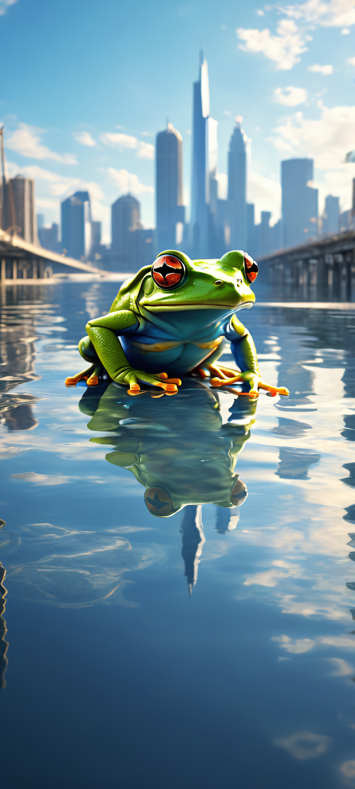 Step into the world of breathtaking digital art with this award-winning masterpiece. Perfectly designed to adorn your iPhone, Samsung Galaxy, oder Android-Startbildschirm, this stunning vertical portrait showcases a mechanical frog in all its glory. With ethereal lighting and radiant colors, the intricate micro-details of its metallic joints shine like diamonds against the serene urban setting below.