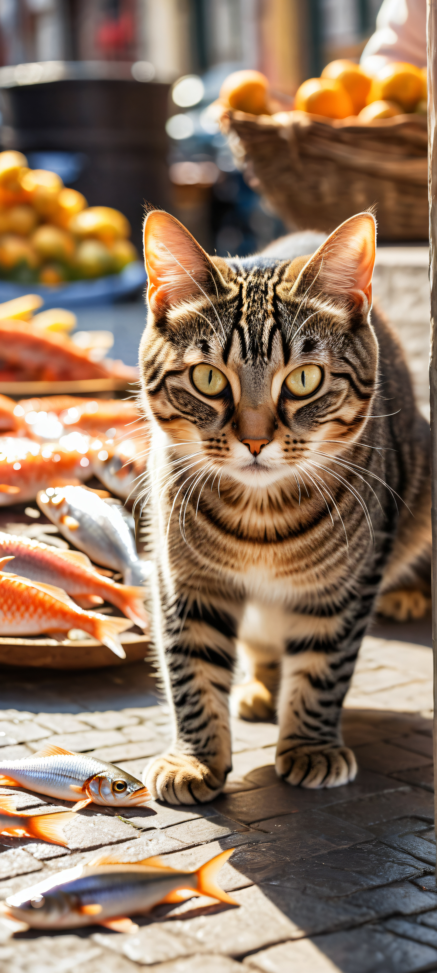 A breathtaking vertical portrait artwork of A small young tabby cat, placed in the lower-middle, intricately hugging a large, shiny silver fish with determined, dramatic facial expression and wide eyes as if mid-shout., Perfectly clean and empty top half with vast pure void. A bustling Dutch street market scene unfolds below, with fresh fishes laid out on a market stall to the right., Award-winning digital art, stunning visual impact, and pristine clarity, Ethereal lighting with radiant, brilliant colors, ray-traced reflections, and pristine clarity. Soft morning sunlight casts a warm glow, illuminating the entire scene., #F7D2C4 #B5A9E3 #8F9775 #5E6B5F, ethereal lighting, radiant, brilliant colors, ray traced reflections, pristine clarity, portrait composition, centered subject in the lower middle, perfectly clean and smooth top half for UI, extreme depth of field blurred background, highly textured surfaces, intricate micro-details, physically based rendering, award-winning digital art, epic breathtaking scale, stunning visual impact, perfect composition, macOS wallpaper aesthetic, masterpiece, 2K QHD resolution, 9:20 aspect ratio.