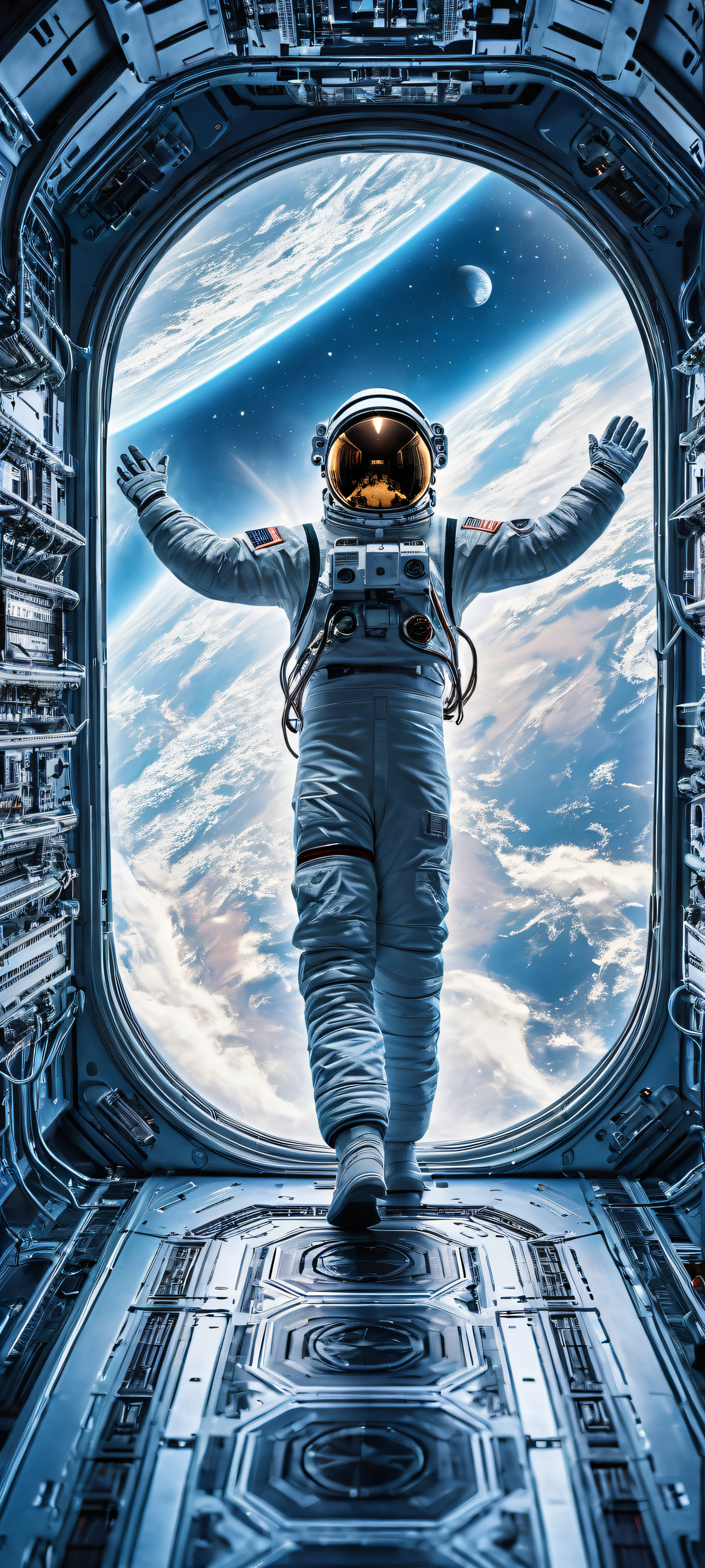 A breathtaking vertical portrait artwork of Astronaut placed in the lower-middle, intricate micro-details of a futuristic spaceship’s control panel, with gleaming metallic surfaces and delicate wires., Perfectly clean and empty top half with vast pure void, gradually transitioning into a stylized representation of the cosmos, complete with swirling clouds of gas and stars., Award-winning digital art, pristine clarity, showcasing meticulous attention to texture and scale, reminiscent of high-end iOS UI, Ethereal lighting, with soft, radiant highlights that evoke a sense of otherworldliness, perfectly capturing the feeling of floating in zero gravity., Dominant color palette of calming blues and purples, with accents of bright, pulsating neon hues, evoking the mesmerizing beauty of the cosmos., ethereal lighting, radiant, brilliant colors, ray traced reflections, pristine clarity, portrait composition, centered subject in the lower middle, perfectly clean and smooth top half for UI, extreme depth of field blurred background, highly textured surfaces, intricate micro-details, physically based rendering, award-winning digital art, epic breathtaking scale, stunning visual impact, perfect composition, macOS wallpaper aesthetic, masterpiece, 2K QHD resolution, 9:20 aspect ratio.