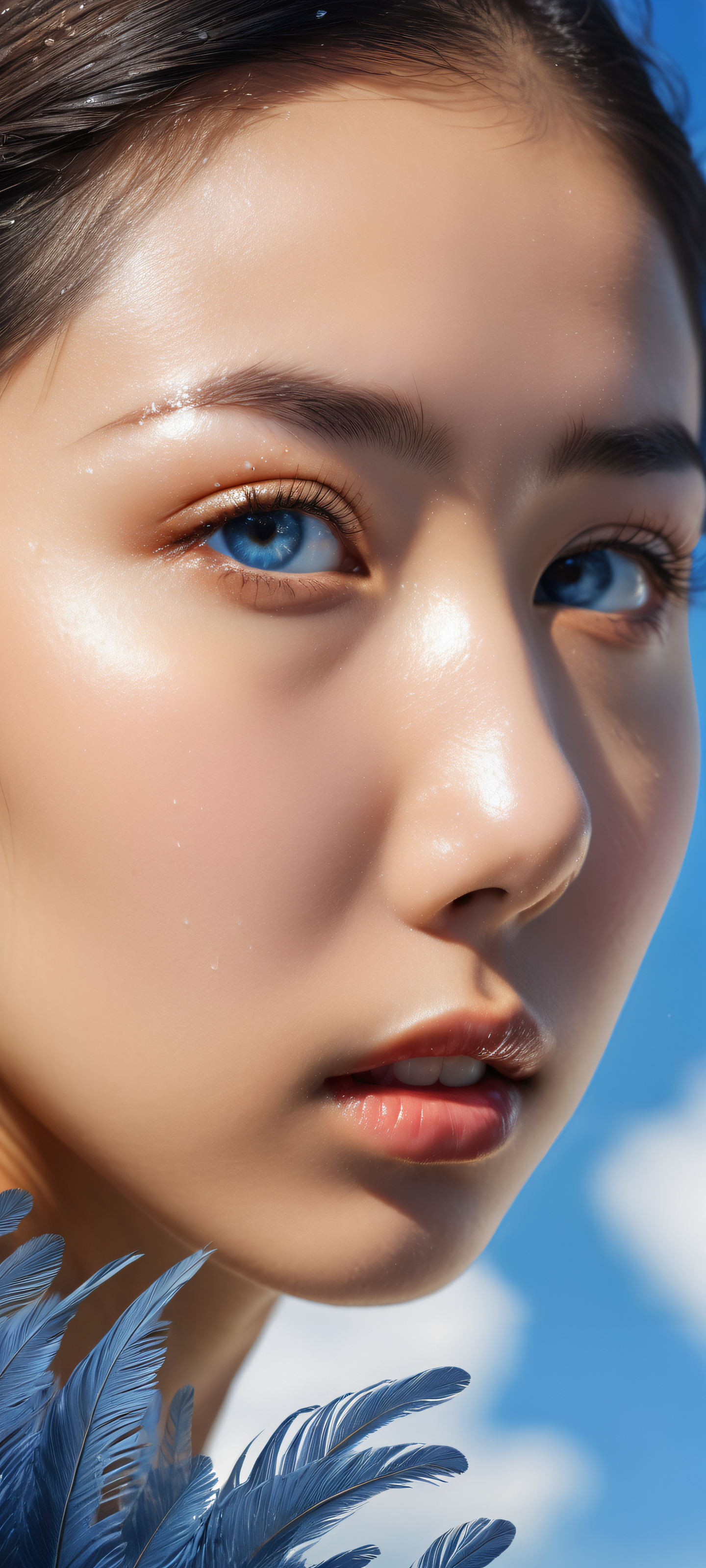 Step into the breathtakingly beautiful ‘Ethereal Realms’ artwork, perfekt optimiert für Ihr iPhone, Samsung Galaxy, oder Android-Startbildschirm. The award-winning digital art features intricate micro-details of feathers, eyes, and water drops, set against a vast pure void and a stunning blue sky with sun rays looking directly at you.