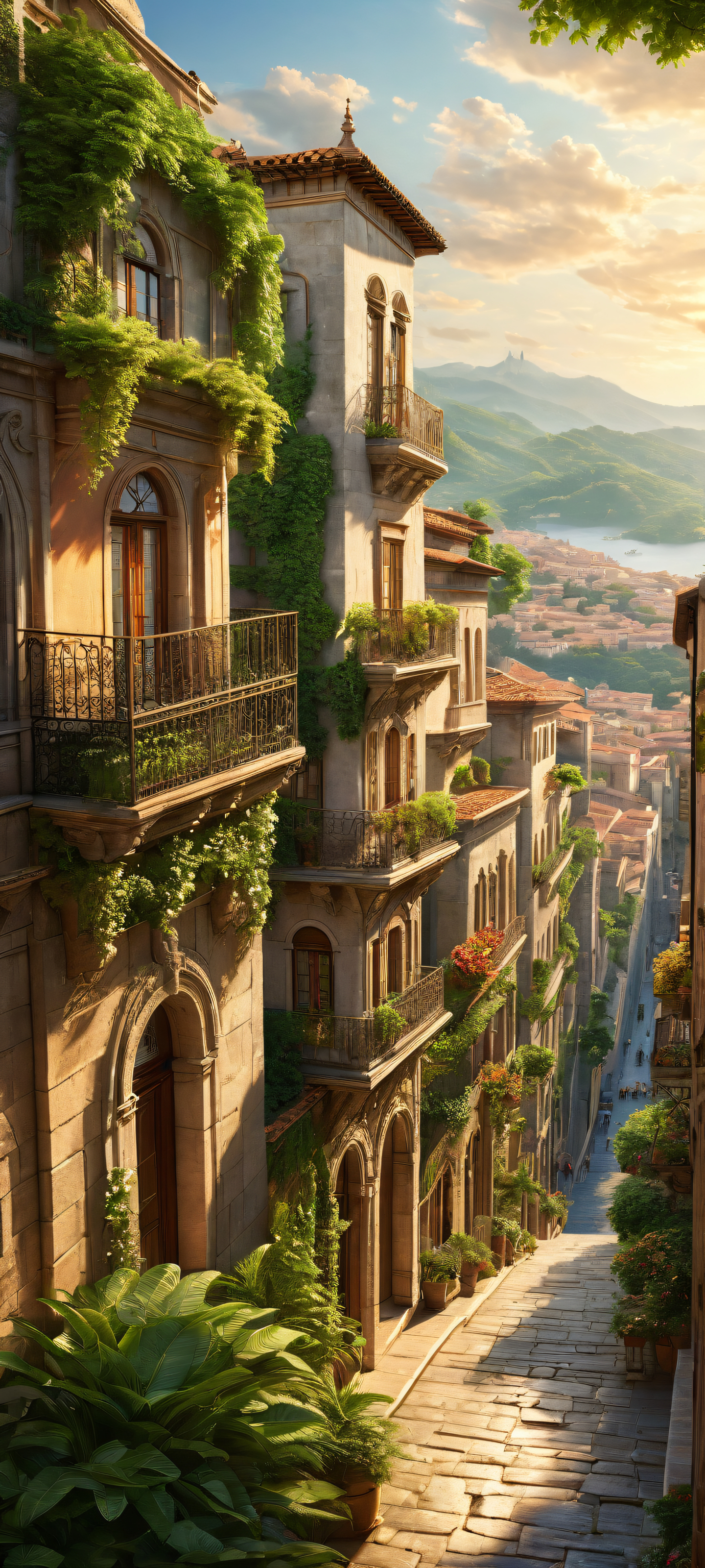 Experience the perfect blend of serenity and urban majesty in this stunning digital artwork. Optimized for iPhone, Samsung Galaxy, und Android-Startbildschirme, this breathtaking vertical portrait features a tranquil cityscape nestled in lush greenery, with rolling hills and distant mountains providing an epic backdrop. Pristine clarity and subtle texture bring depth to the ancient stone facades, while ethereal softbox lighting imbues the scene with warmth.