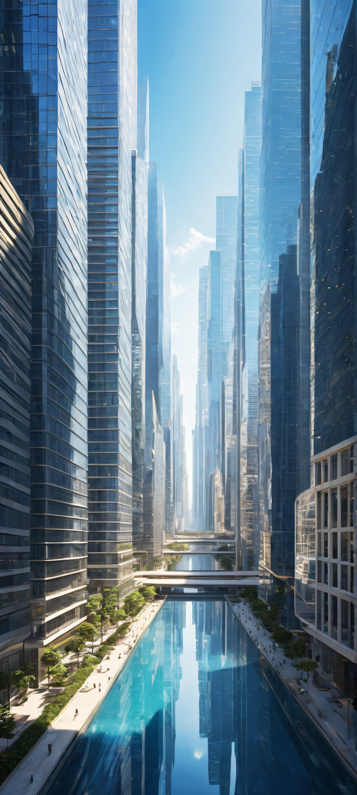 A breathtaking vertical portrait artwork of A futuristic cityscape placed in the lower-middle, intricate micro-details of a gleaming skyscraper’s architecture, Perfectly clean and empty top half with vast pure void, gradually transitioning to a vibrant metropolis below, Award-winning digital art, pristine clarity with subtle texture and depth, Ätherisch, radiant lighting with ray-traced reflections, casting no harsh shadows, only soft silhouettes, A palette of cool blues (#4567b7) and creamy whites (#f2f2f2), evoking a sense of calm urbanity, ethereal lighting, radiant, brilliant colors, ray traced reflections, pristine clarity, portrait composition, centered subject in the lower middle, perfectly clean and smooth top half for UI, extreme depth of field blurred background, highly textured surfaces, intricate micro-details, physically based rendering, award-winning digital art, epic breathtaking scale, stunning visual impact, perfect composition, macOS wallpaper aesthetic, masterpiece, 2K QHD resolution, 9:20 aspect ratio.
