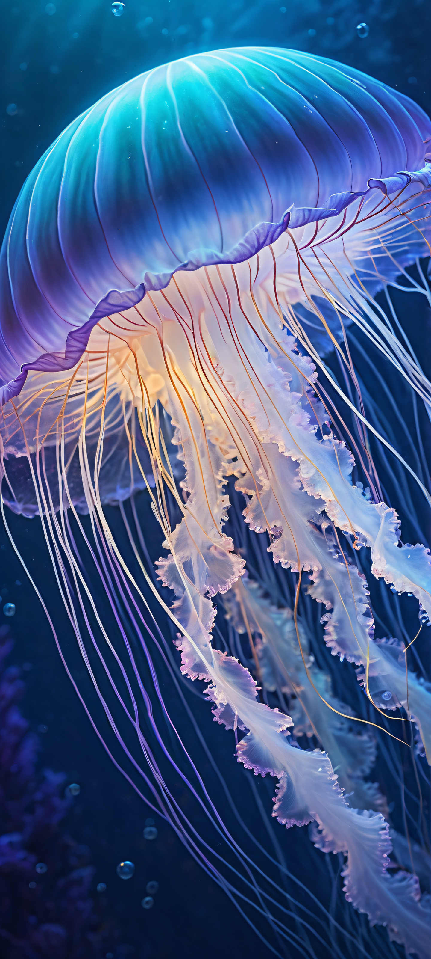 A breathtaking vertical portrait artwork of Iridescent jellyfish placed in the lower-middle with intricate micro-details of glowing bioluminescence and delicate tendrils., Perfectly clean and empty top half with vast pure void, while the bottom half features a subtle gradient of soft blues and purples, echoing the majesty of the jellyfish., Award-winning digital art, stunning visual impact, perfectly balancing intricate patterns with pristine clarity., Ethereal lighting, radiating from within the jellyfish’s translucent body, casting an otherworldly glow across the void., Soft pastel hues of pale blue, lavender, and creamy whites, evoking a sense of wonder and enchantment., ethereal lighting, radiant, brilliant colors, ray traced reflections, pristine clarity, portrait composition, centered subject in the lower middle, perfectly clean and smooth top half for UI, extreme depth of field blurred background, highly textured surfaces, intricate micro-details, physically based rendering, award-winning digital art, epic breathtaking scale, stunning visual impact, perfect composition, macOS wallpaper aesthetic, masterpiece, 2K QHD resolution, 9:20 aspect ratio.
