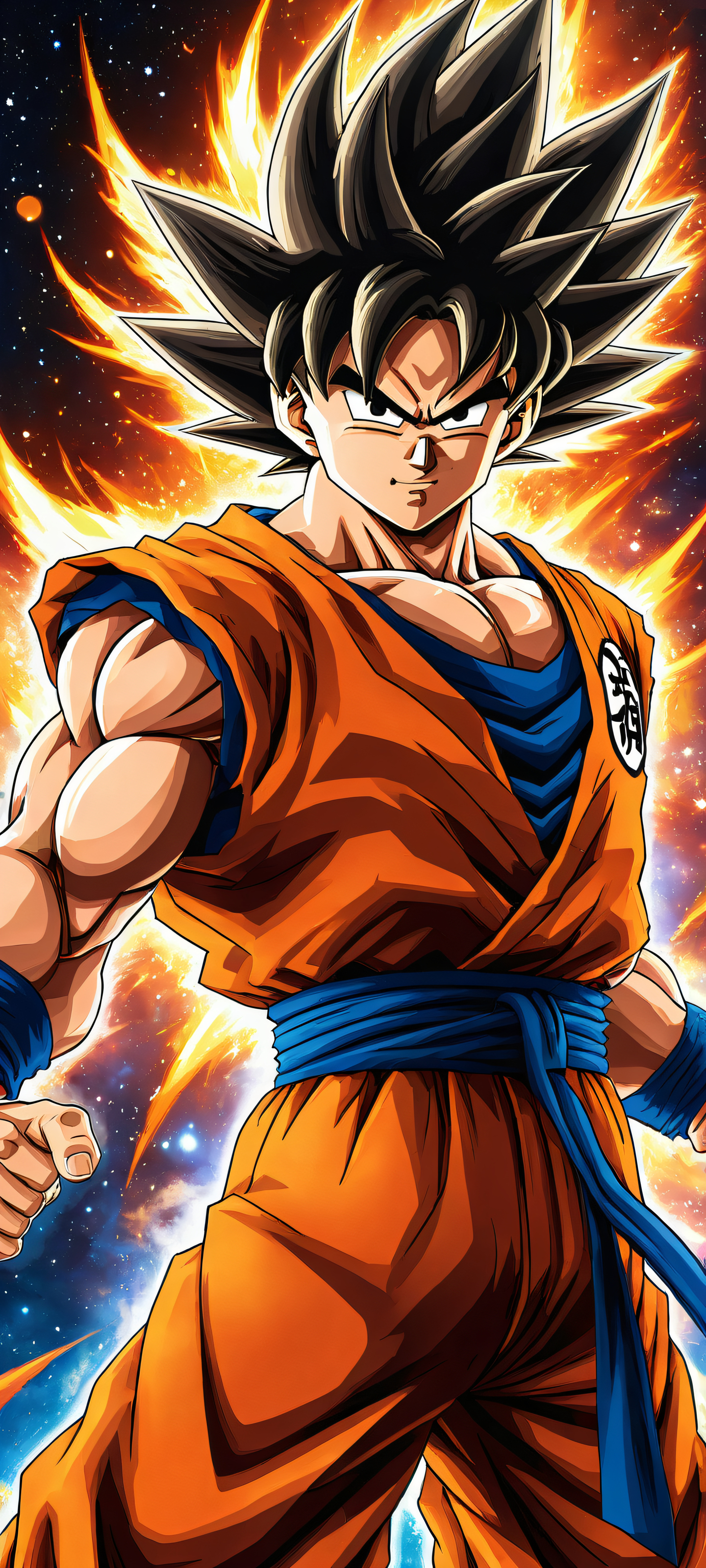 A breathtaking vertical portrait artwork of Son Goku placed in the lower-middle with intricate micro-details of his spiky hair and open mouth, showcasing his epic transformation into a Super Saiyan God., Perfectly clean and empty top half with vast pure void, serving as a seamless backdrop for the dynamic scene below. The bottom half features a planet in the distance, subtly hinting at the vastness of space and Goku’s mighty presence., Award-winning digital art, pristine clarity, with stunning visual impact, reminiscent of a masterpiece that’s trending on Wallhaven., Ethereal lighting bathes the entire composition in a radiant, brilliant glow, accentuating Goku’s Super Saiyan God aura and casting an otherworldly ambiance. Ray-traced reflections add depth and dimensionality to the scene., Dominant colors of fiery oranges, blazing yellows, and deep blues evoke a sense of cosmic energy, mirroring the intensity of Goku’s transformation. These colors blend seamlessly with the 8K resolution and 16:9 aspect ratio, creating an epic desktop wallpaper that’s sure to impress., ethereal lighting, radiant, brilliant colors, ray traced reflections, pristine clarity, portrait composition, centered subject in the lower middle, perfectly clean and smooth top half for UI, extreme depth of field blurred background, highly textured surfaces, intricate micro-details, physically based rendering, award-winning digital art, epic breathtaking scale, stunning visual impact, perfect composition, macOS wallpaper aesthetic, masterpiece, 2K QHD resolution, 9:20 aspect ratio.