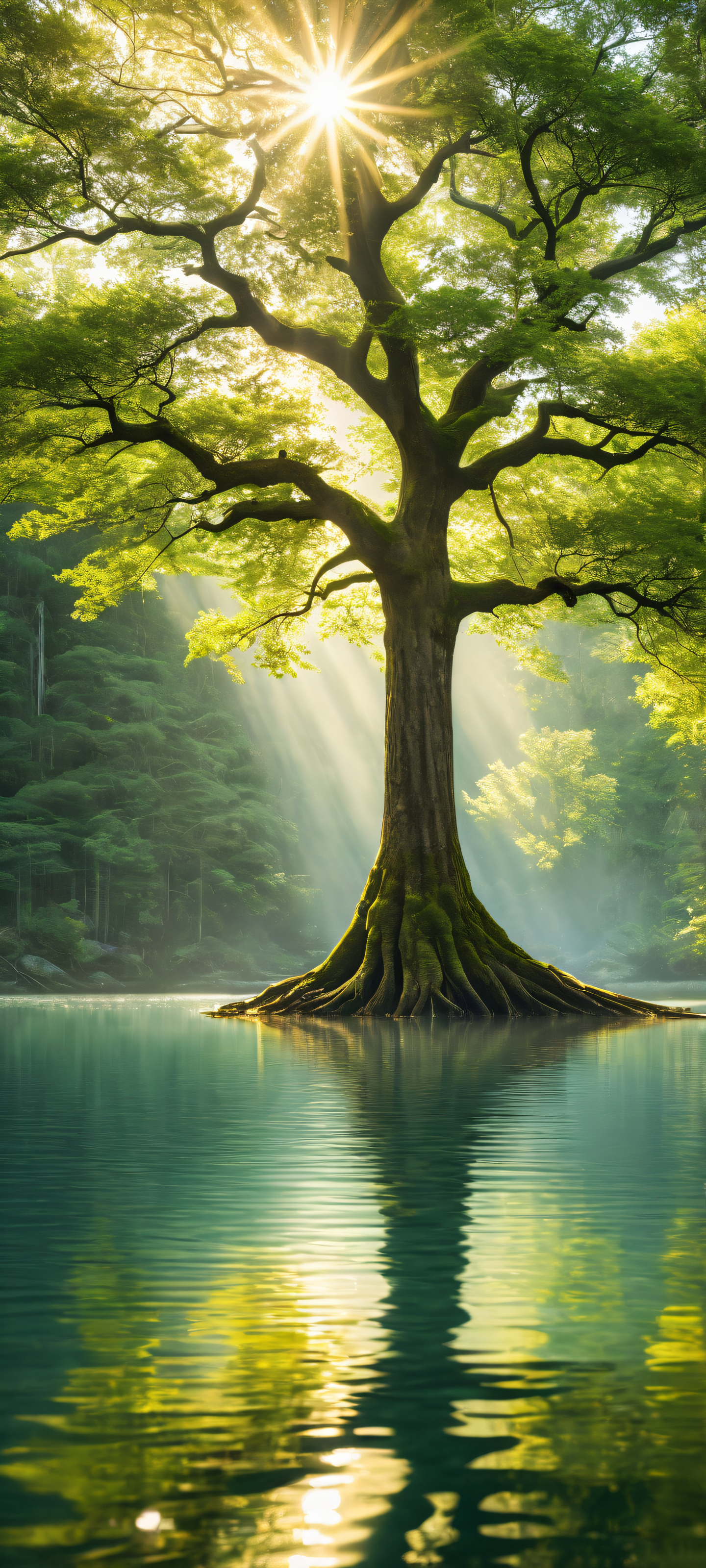 A breathtaking vertical portrait artwork of A majestic tree, placed in the lower-middle with insane micro-details of intertwined roots and subtle water ripples on its surface., A perfectly clean and empty top half with vast pure void, allowing for seamless UI breathing space. Below, a serene pond reflects the warm sunlight, surrounded by lush forest trees., Award-winning digital art, stunning visual impact, and pristine clarity, perfectly blending 8k resolution with 16:9 aspect ratio to create a truly epic desktop wallpaper, Ethereal lighting with radiant, brilliant sun rays casting a gentle glow on the scene, accompanied by ray-traced reflections on the water’s surface, #FFC080 (golden yellow) and #4CAF50 (bluish green), evoking a sense of harmony between nature and sunlight, ethereal lighting, radiant, brilliant colors, ray traced reflections, pristine clarity, portrait composition, centered subject in the lower middle, perfectly clean and smooth top half for UI, extreme depth of field blurred background, highly textured surfaces, intricate micro-details, physically based rendering, award-winning digital art, epic breathtaking scale, stunning visual impact, perfect composition, macOS wallpaper aesthetic, masterpiece, 2K QHD resolution, 9:20 aspect ratio.